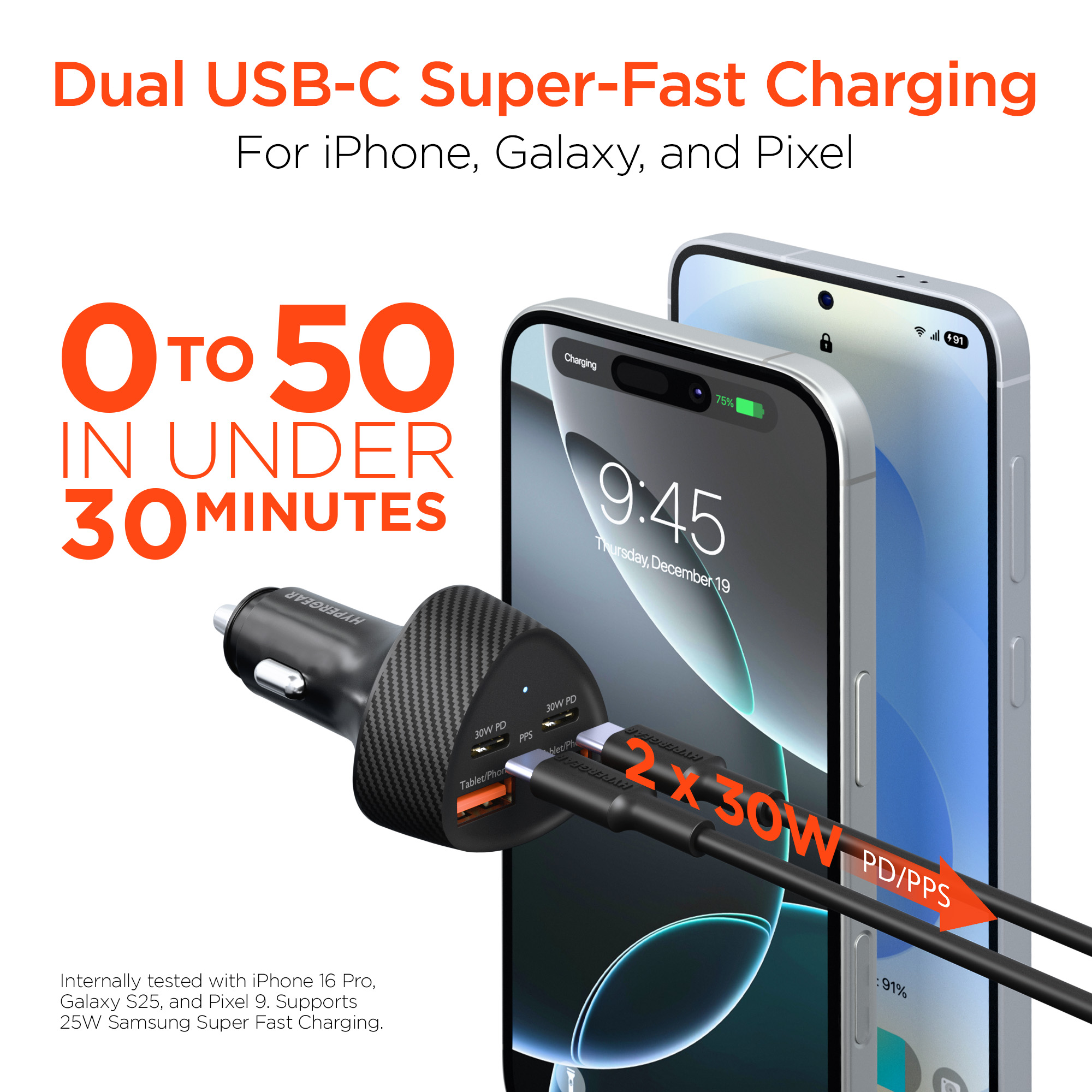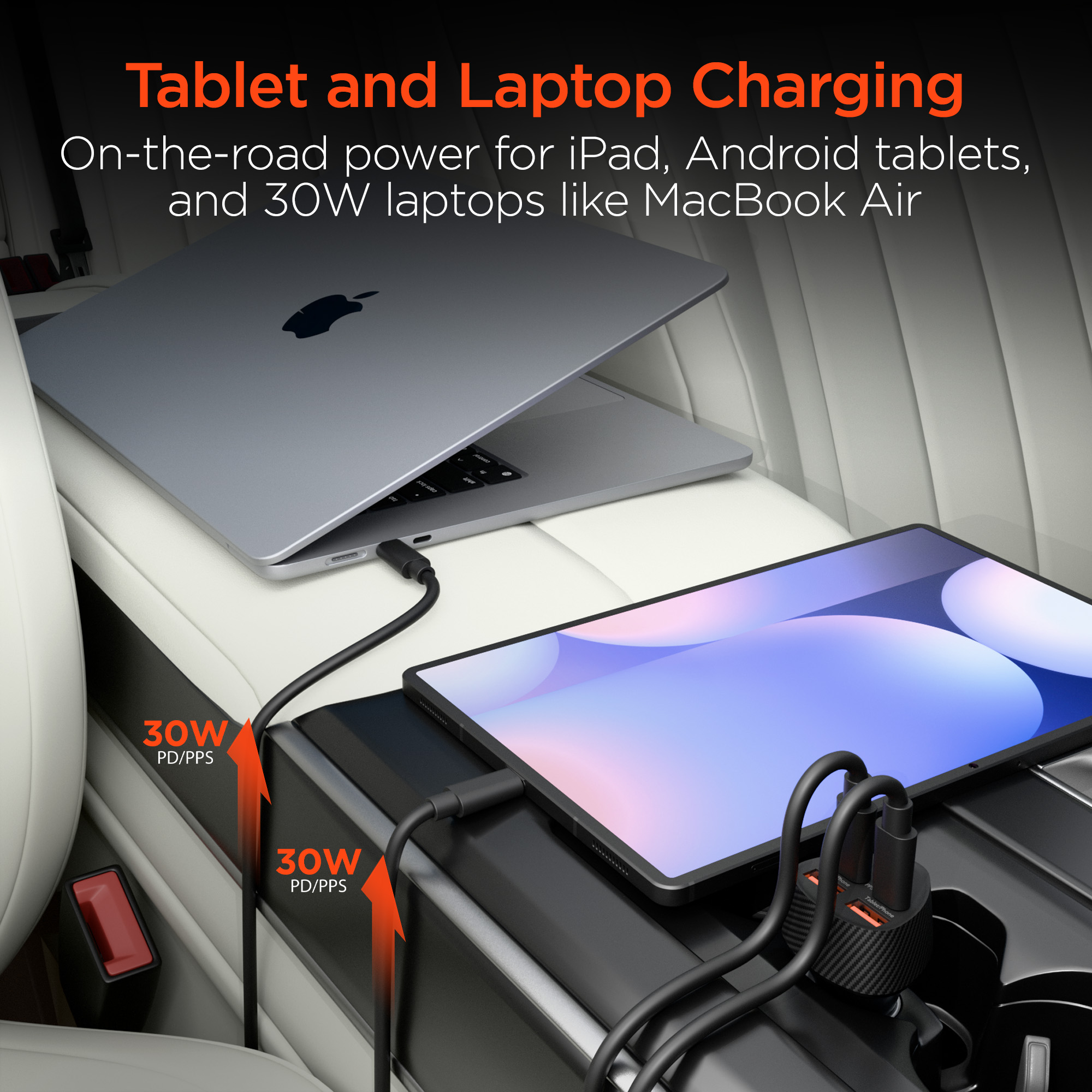 SpeedBoost 77W Quad-Port Fast Car Charger with Dual 30W USB-C PD PPS | 4ft USB-C Cable | Black4-port design | Dual super-fast charging for phones and tablets | Full-speed charging for MacBook Air and Chromebooks |