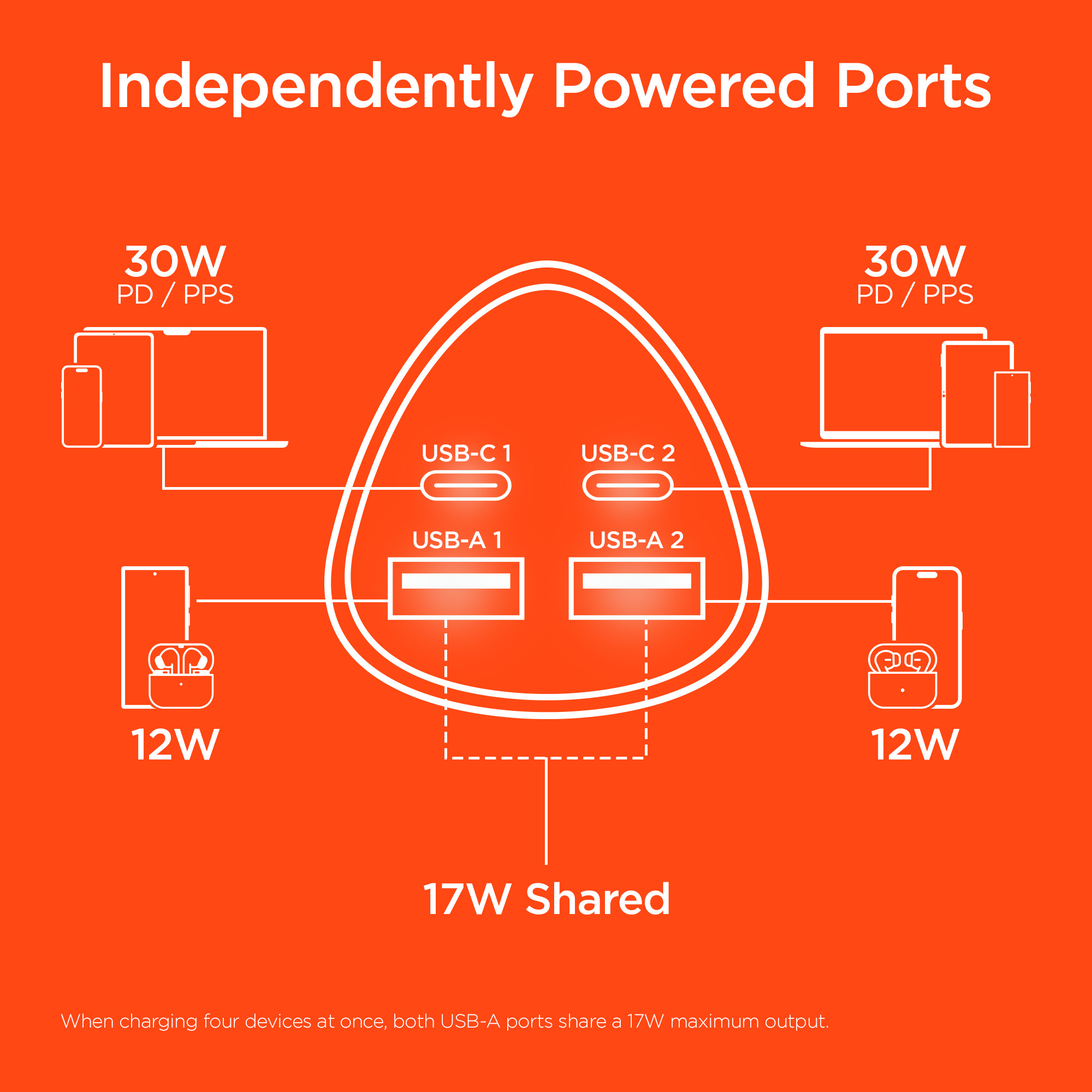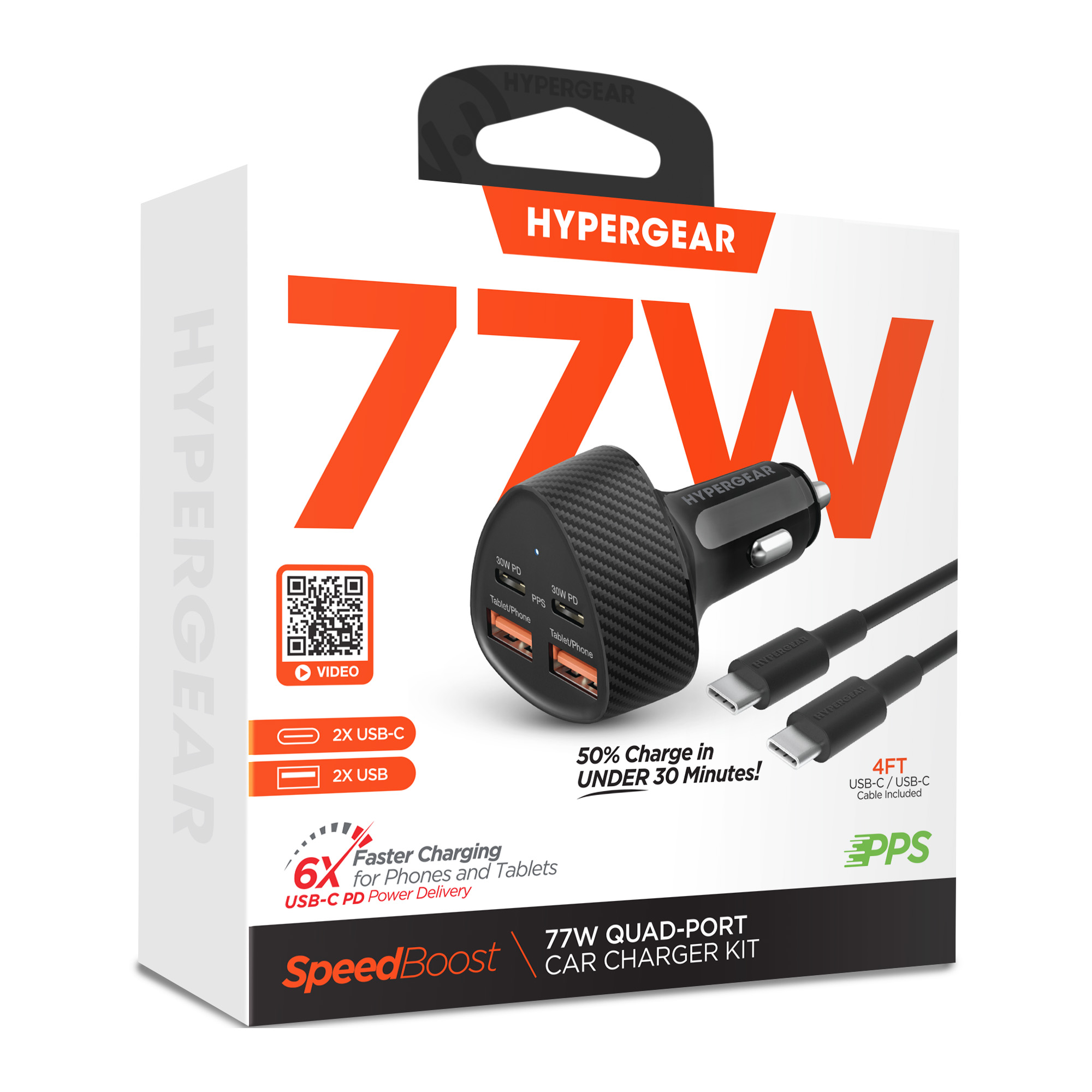 Charge in the fast lane with the SpeedBoost 77W Quad-Port Car Charger our most powerful and most versatile on-the-road charger, upgraded with 50% more charging power! Now with dual 30W USB-C Power Delivery ports each packing 6X the power of your cars standard built-in USB, you can super-fast charge your iPhone, Galaxy, or Pixel phone from 0 to 50% in around 25 minutes while you simultaneously get a full-speed charge for your iPad, Android tablet, or even your MacBook Air. Both USB-C ports are enhanced with PPS technology for auto-optimized output that protects your batteries against overheating without sacrificing speed, and we also threw in a pair of high-speed USB ports so you can charge up to 4 devices at the same time. Includes a 4ft USB-C cable, so you can give your devices a SpeedBoost right away.