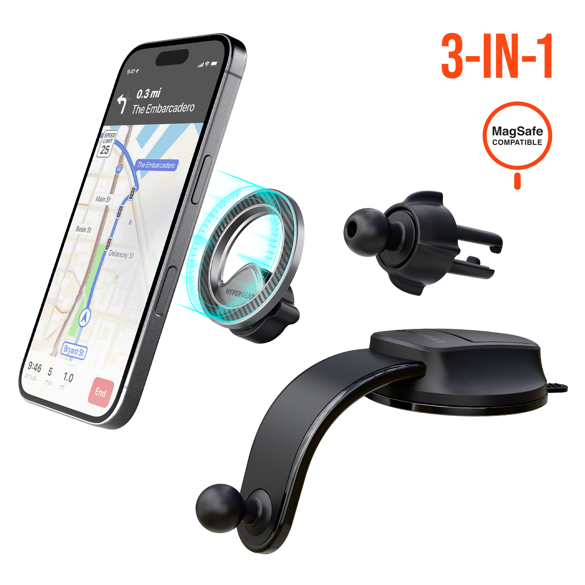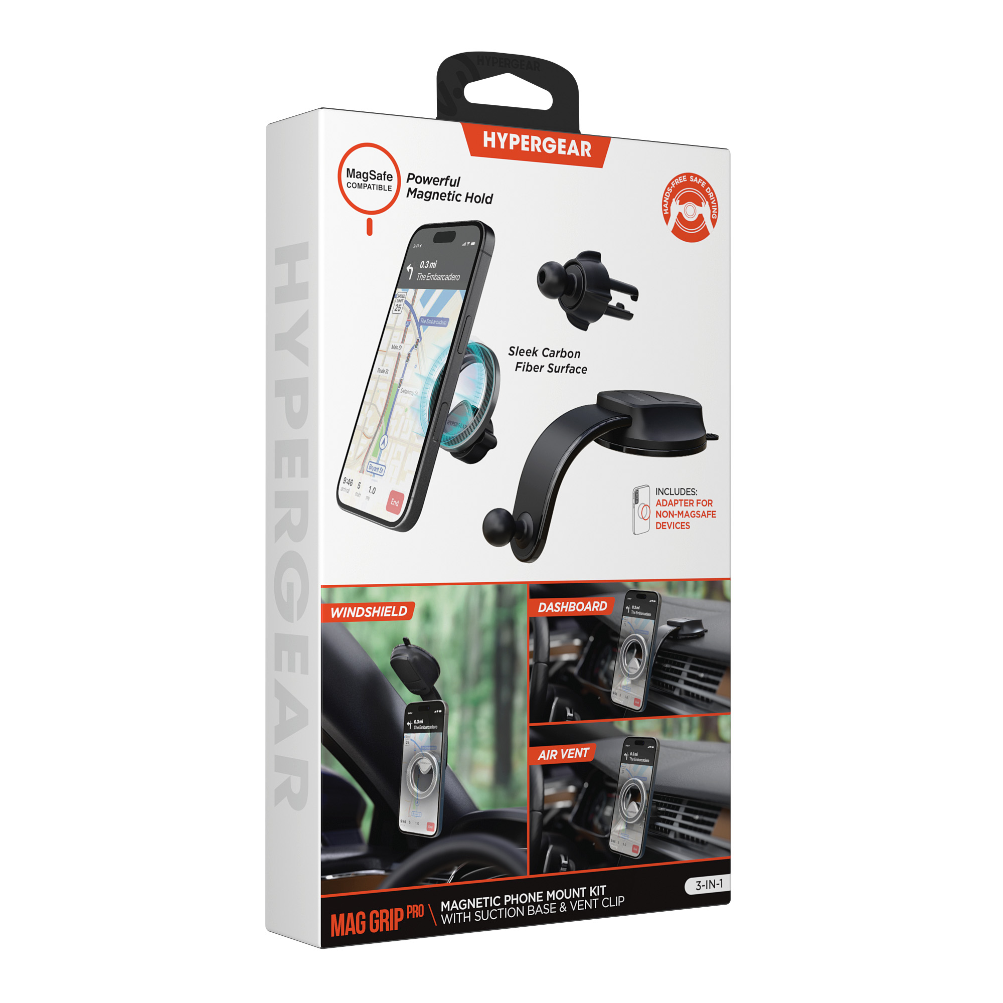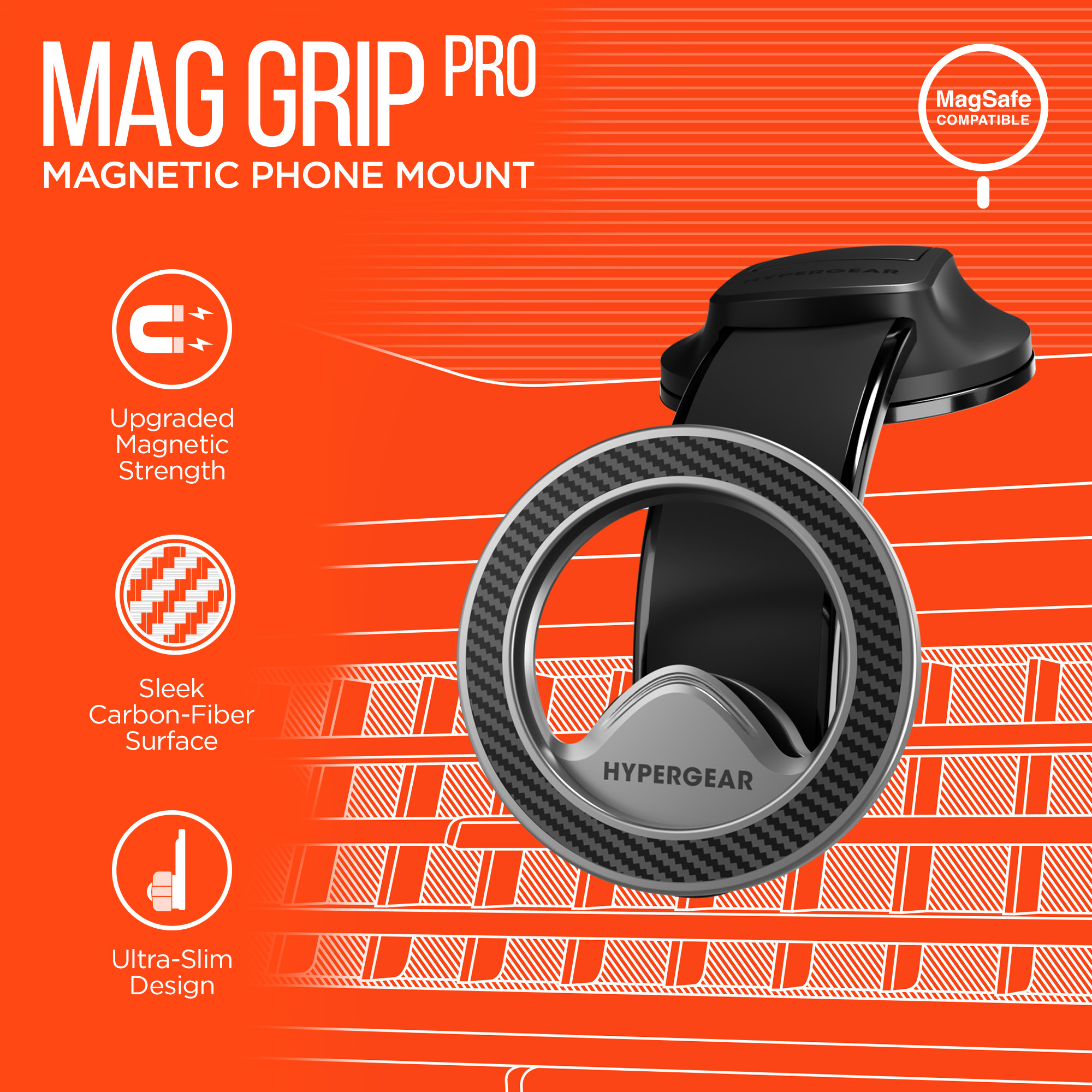 Snap On Drive Snap Off Its that easy. Designed with an ultra-slim profile and a sleek carbon-fiber surface, the Mag Grip Pro Magnetic Phone Mount from HyperGear levels up your daily drive with MagSafe convenience and minimalist style. Its built with twelve N52-grade magnets for a more powerful magnetic grip, making it 50% stronger than standard and rated to hold up to 4 pounds of weight so your phone stays locked in place no matter how rough the road gets. Compatible with MagSafe iPhone models and cases, and includes an adhesive adapter ring for non-MagSafe cases and Android devices.