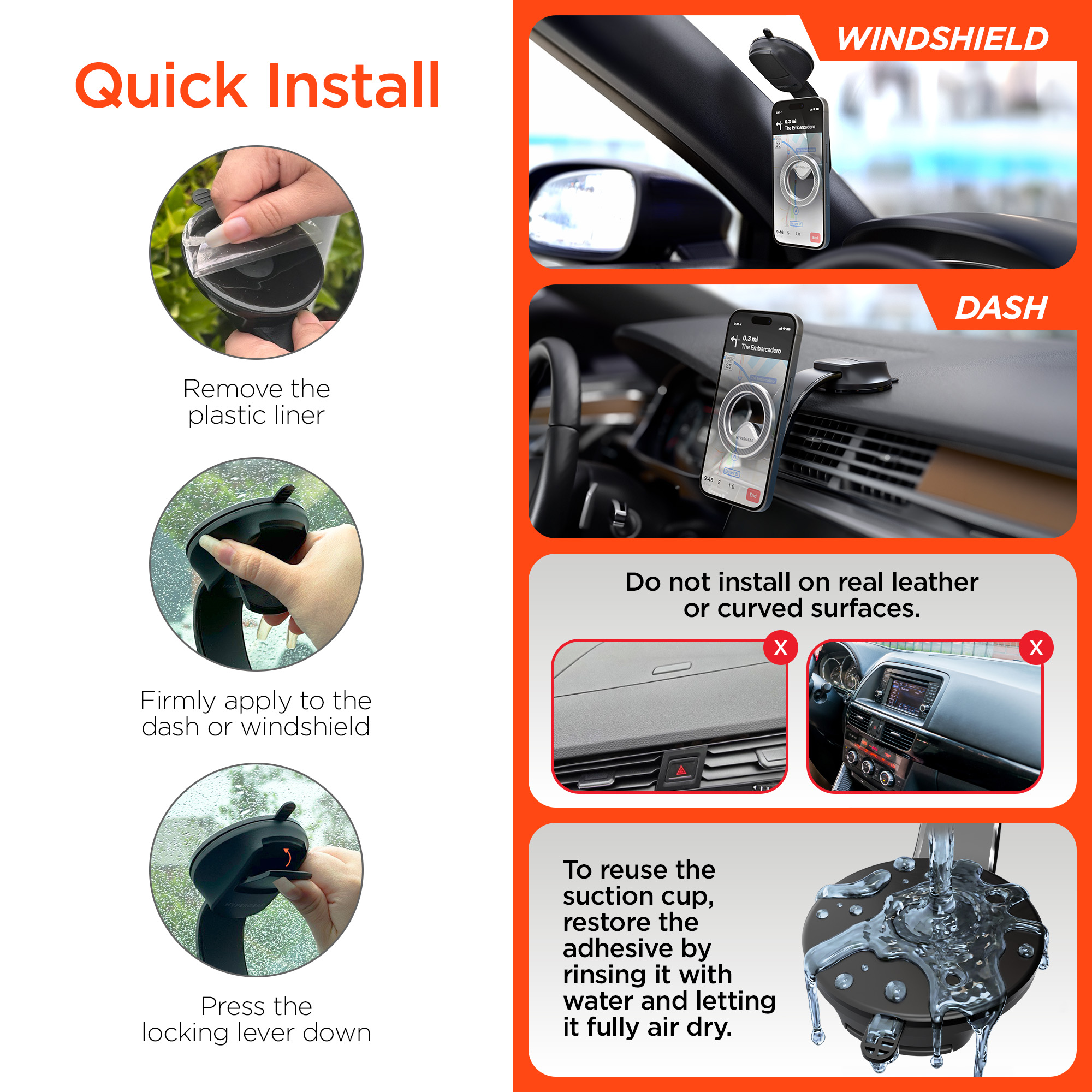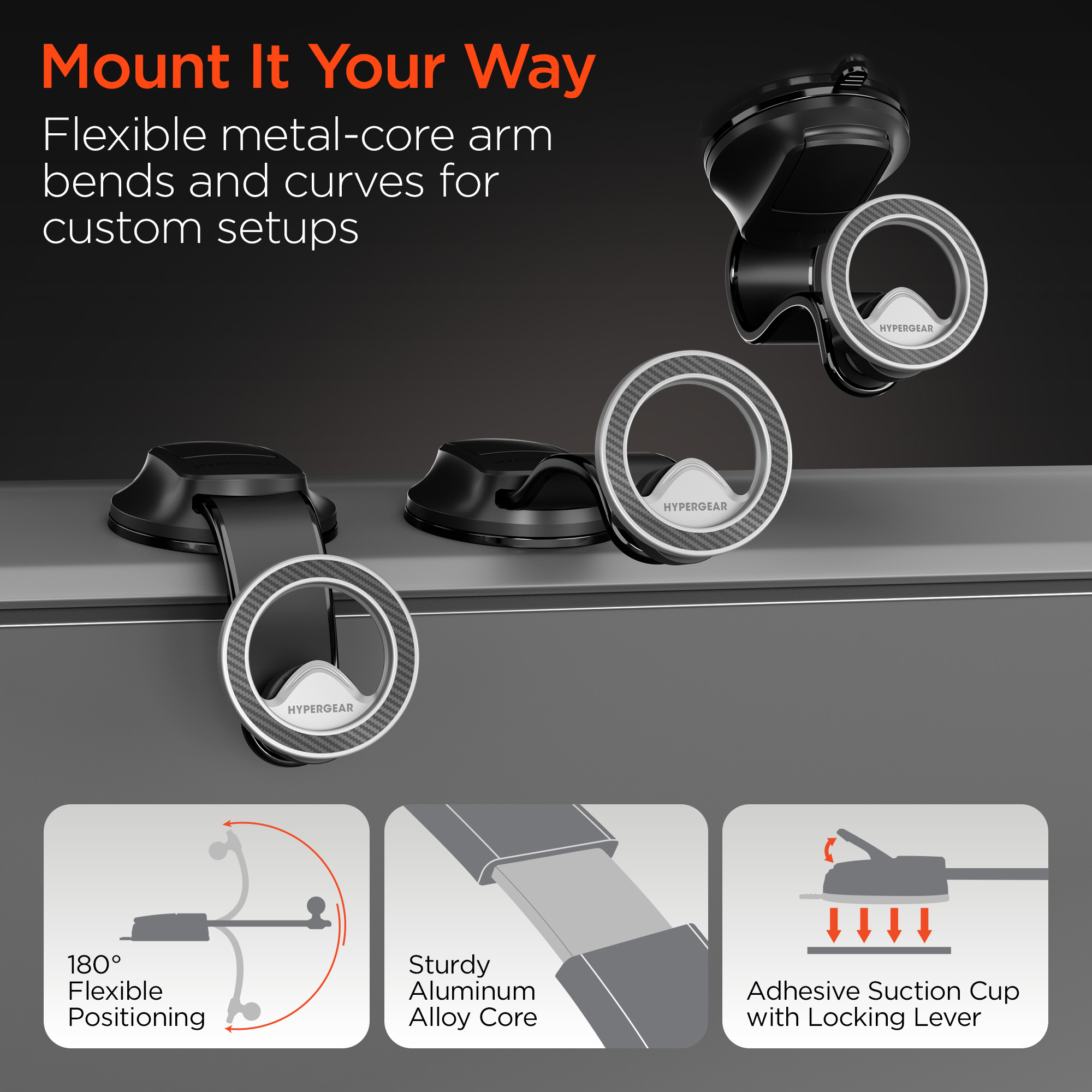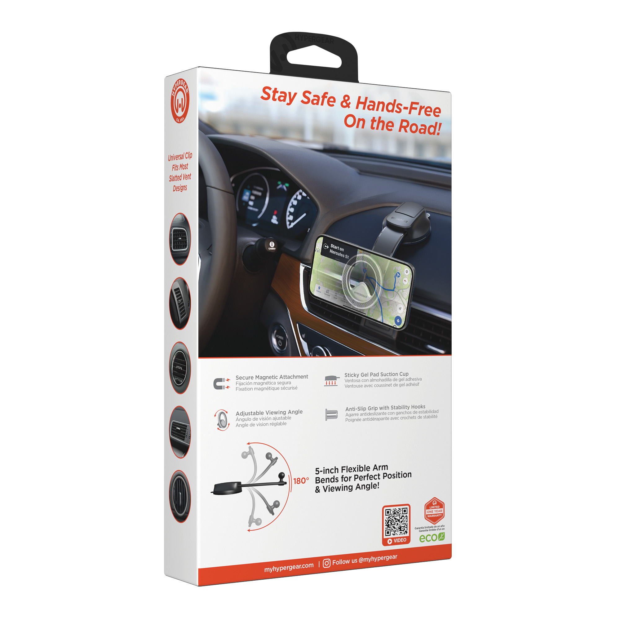 Snap On Drive Snap Off Its that easy. Designed with an ultra-slim profile and a sleek carbon-fiber surface, the Mag Grip Pro Magnetic Phone Mount from HyperGear levels up your daily drive with MagSafe convenience and minimalist style. Its built with twelve N52-grade magnets for a more powerful magnetic grip, making it 50% stronger than standard and rated to hold up to 4 pounds of weight so your phone stays locked in place no matter how rough the road gets. Compatible with MagSafe iPhone models and cases, and includes an adhesive adapter ring for non-MagSafe cases and Android devices.