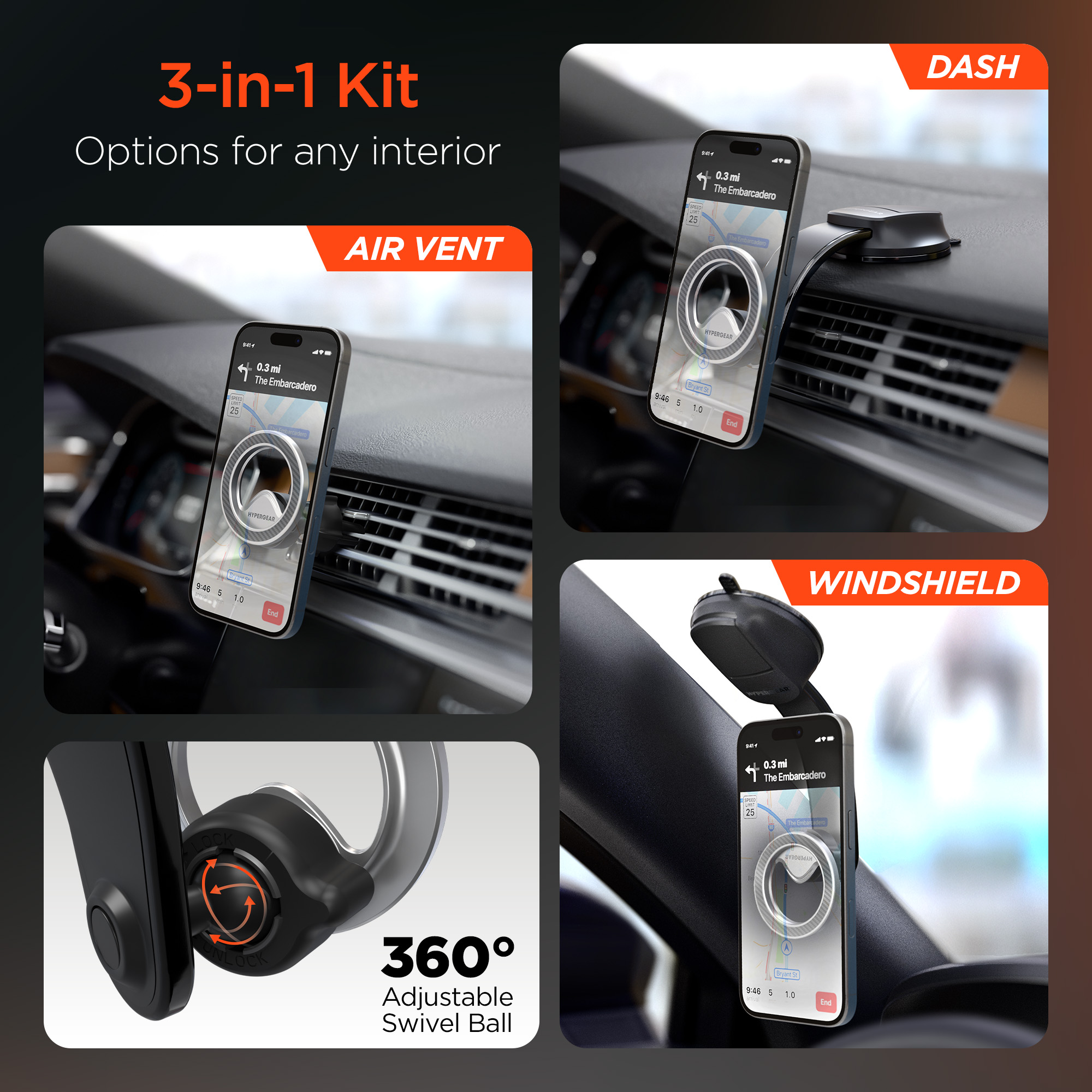 Mag Grip Pro Magnetic Phone Mount 3-in-1 Kit | Vent + Dashboard + Windshield | Silver MagSafe-compatible ultra-sleek magnetic phone mount. Includes air vent clip and 180° flexible arm mount bases. |