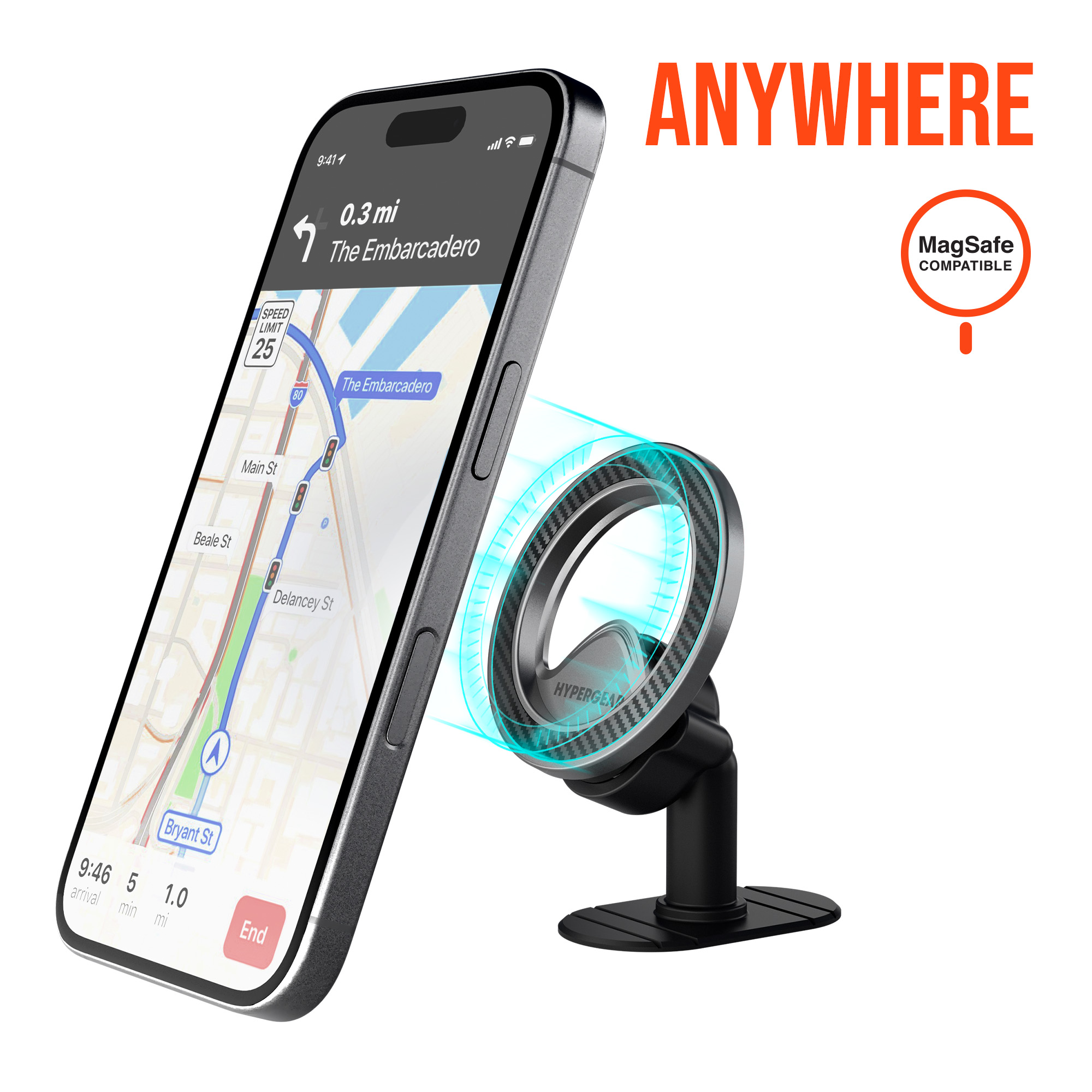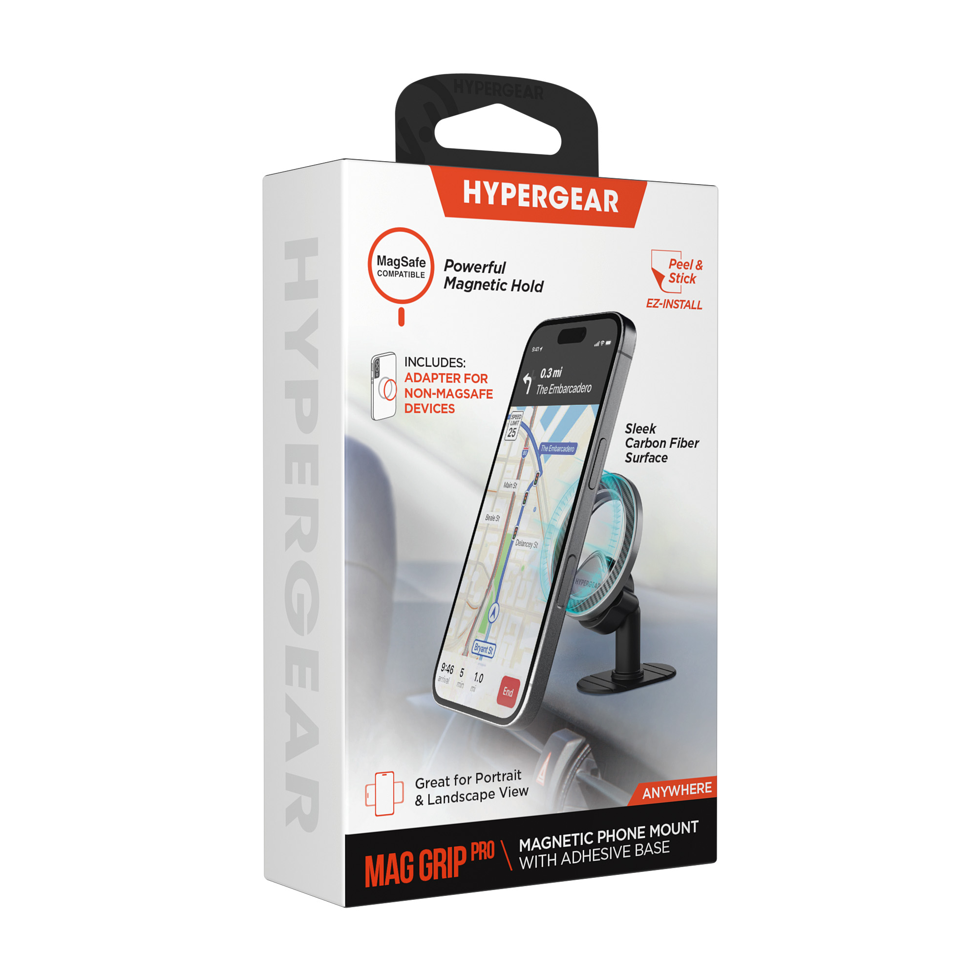 Snap On Drive Snap Off Its that easy. Designed with an ultra-slim profile and a sleek carbon-fiber surface, the Mag Grip Pro Magnetic Phone Mount from HyperGear levels up your daily drive with MagSafe convenience and minimalist style. Its built with twelve N52-grade magnets for a more powerful magnetic grip, making it 50% stronger than standard and rated to hold up to 4 pounds of weight so your phone stays locked in place no matter how rough the road gets. Compatible with MagSafe iPhone models and cases, and includes an adhesive adapter ring for non-MagSafe cases and Android devices.