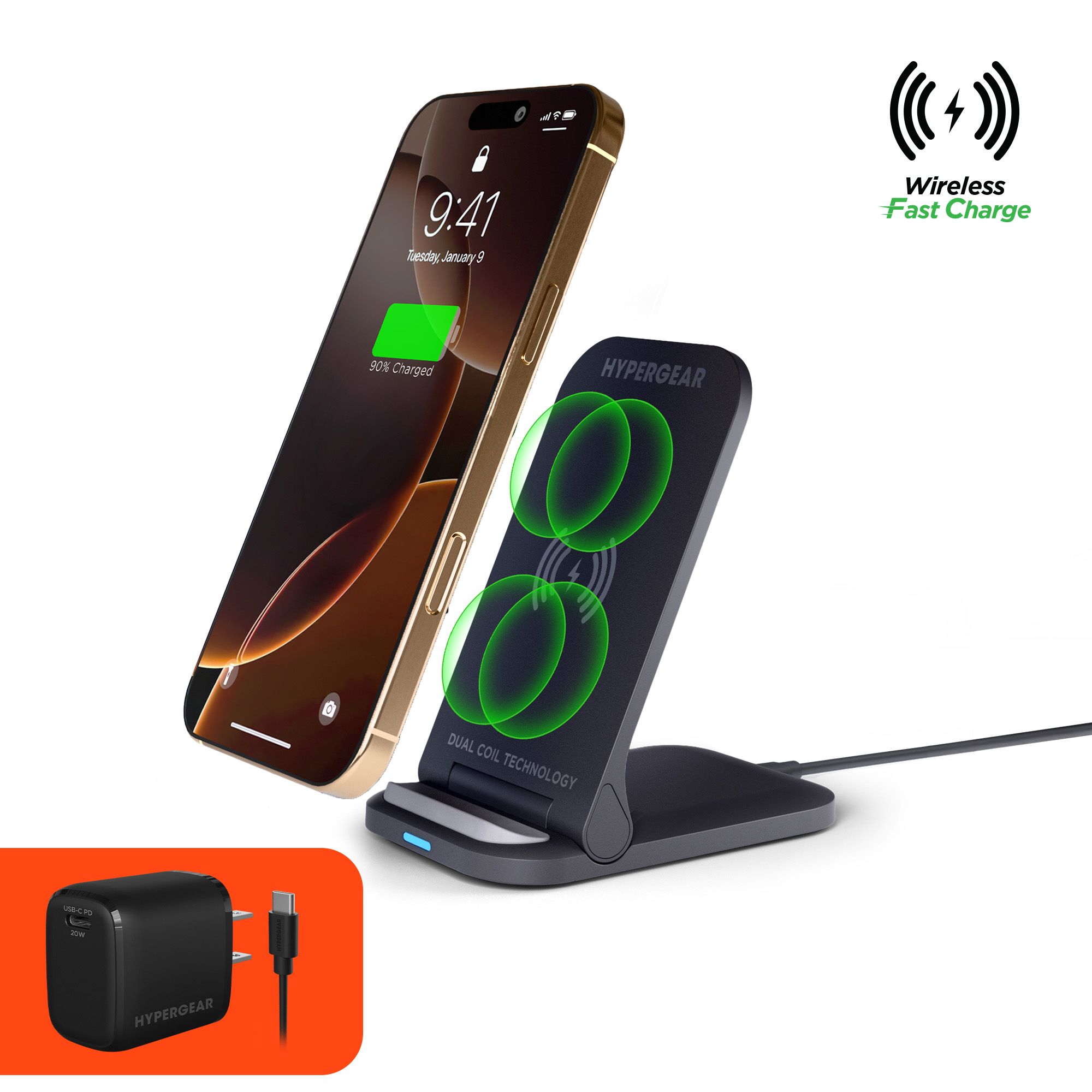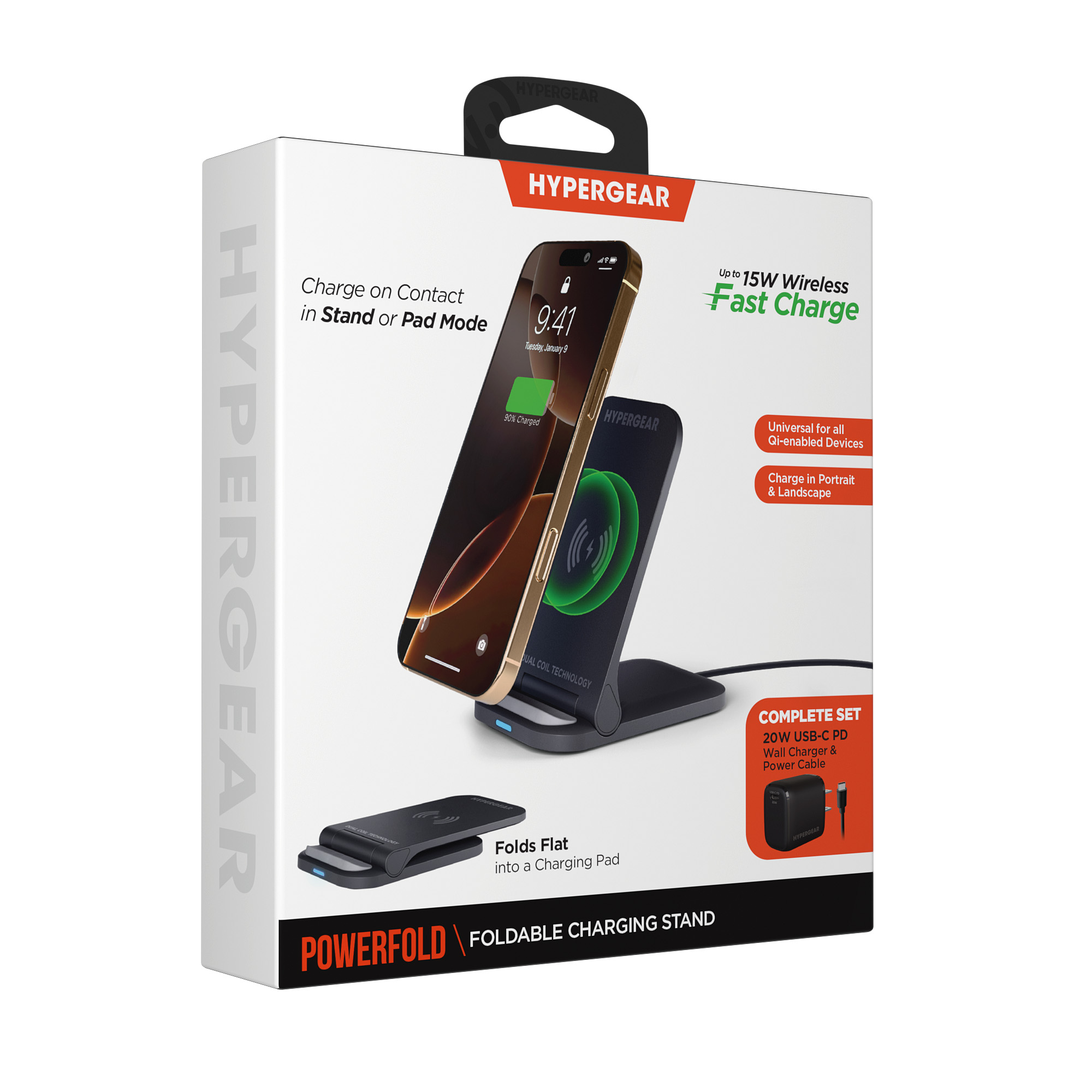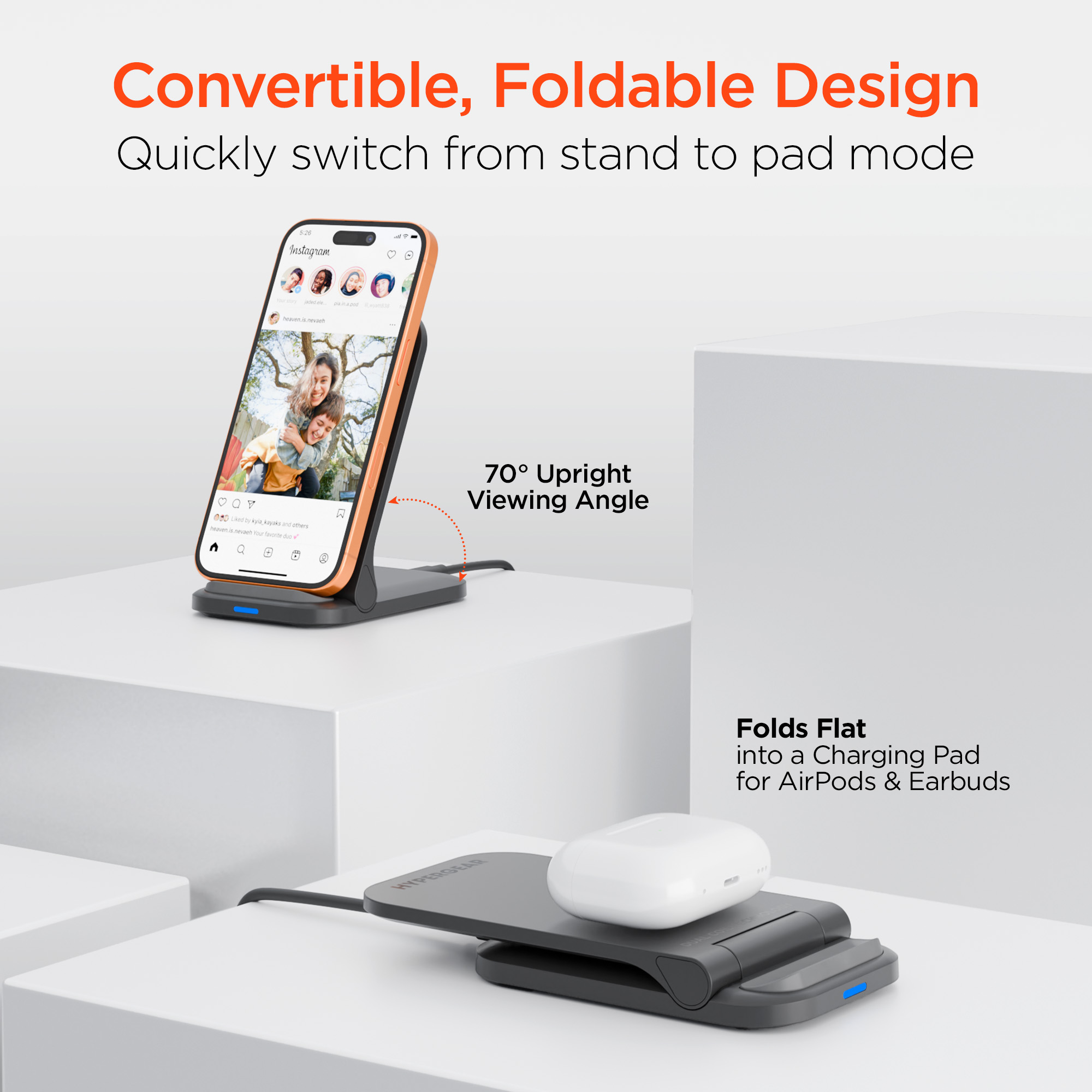 Fast charge on contact with the PowerFold Wireless Charging Stand from HyperGear. Designed for everyday charging, just place your Qi-enabled phone on the stand to power up with your screen in view so you can watch videos, play games, or keep an eye on your notifications while you work. The dual coil charging surface delivers up to 15W and makes wireless charging effortlessly easy no more worrying about finding the sweet spot, and you can even charge in both portrait and landscape! Need to charge your earbuds instead? Fold the stand down to convert it into a charging pad and with its ultra-slim profile, its perfectly portable and great for wireless charging on the go.