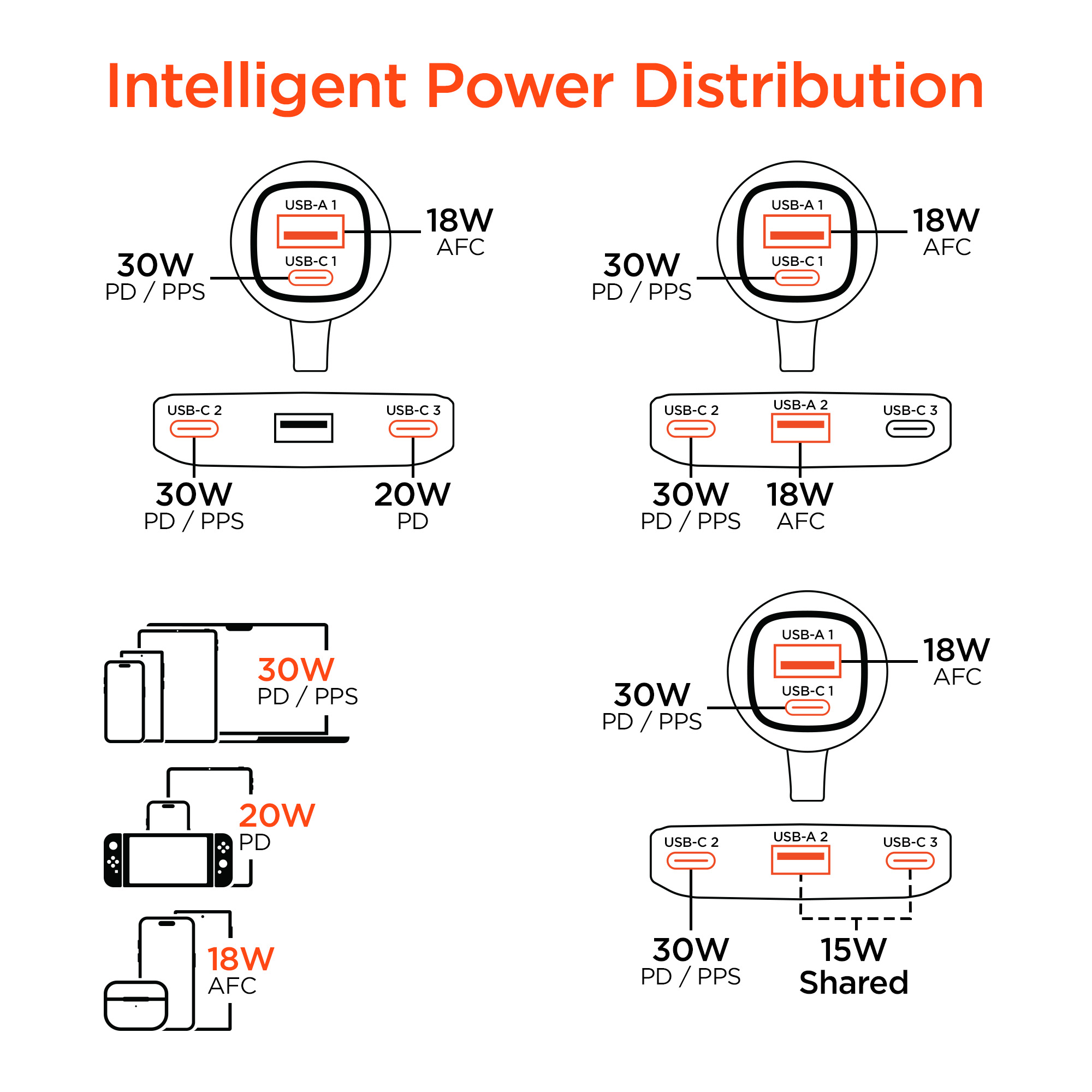 3-Port Backseat Hub: 30W USB-C Power Delivery with PPS + 20W USB-C Power Delivery + 18W USB Adaptive Fast Charge