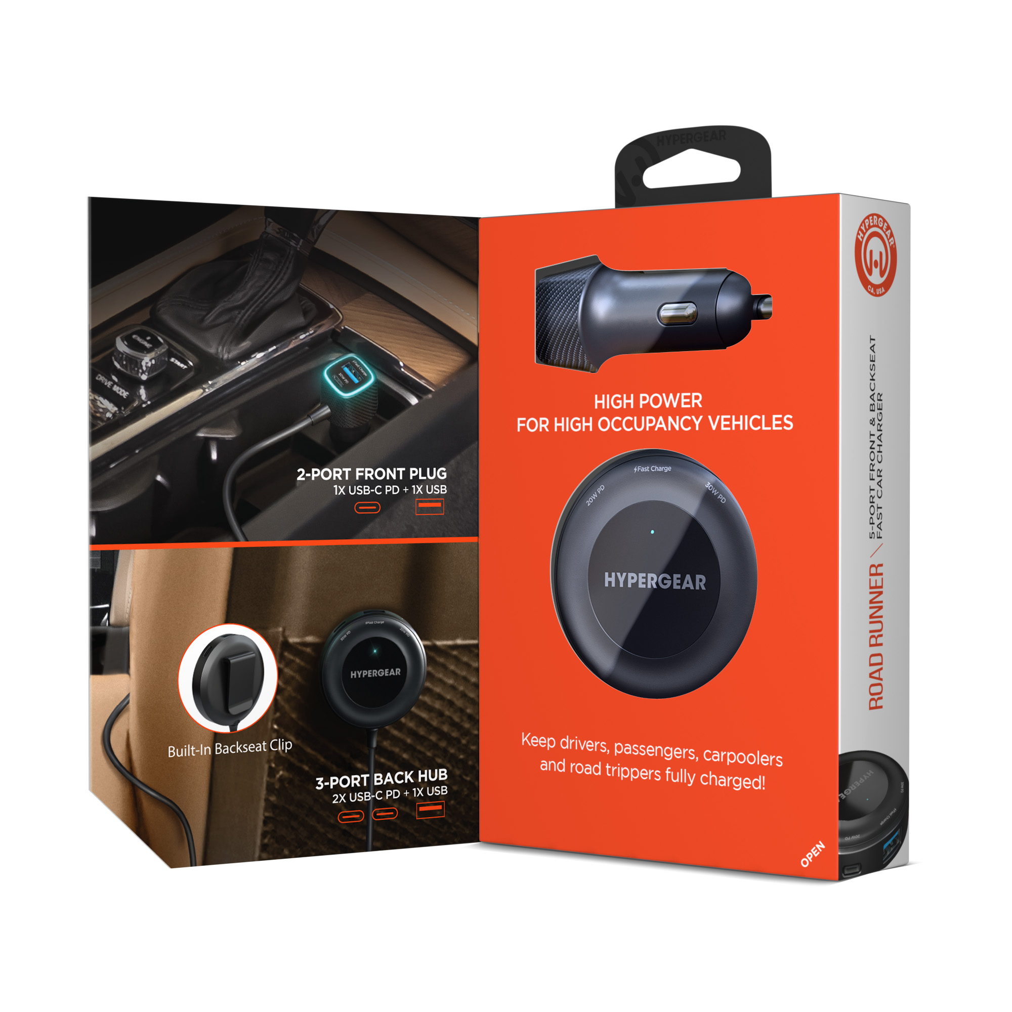 Road Runner 98W 5-Port Front & Backseat Fast Car Charger with Dual 30W USB-C PD PPS | BlackHyperGear Road Runner 98W 5 Ports Car Charger Black |