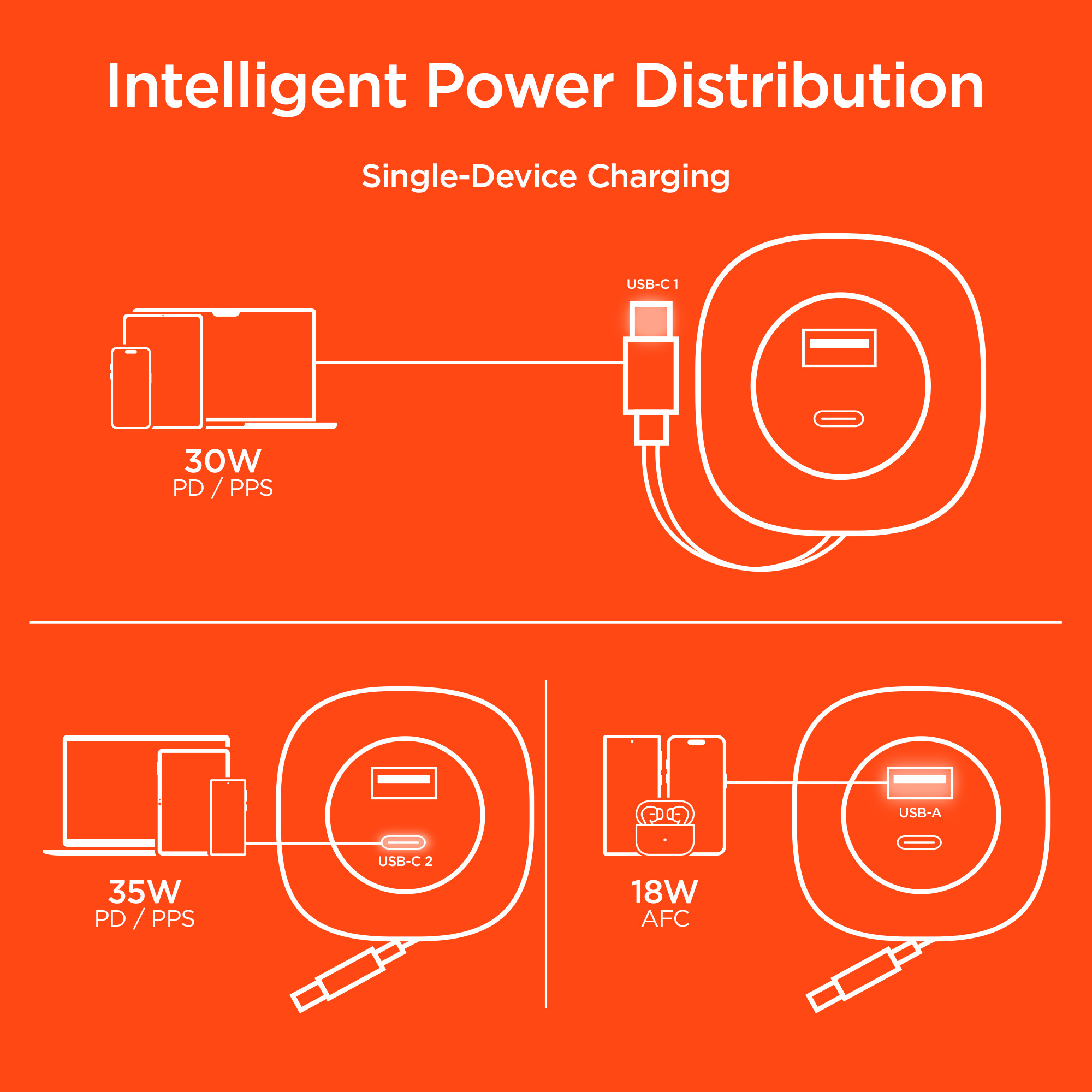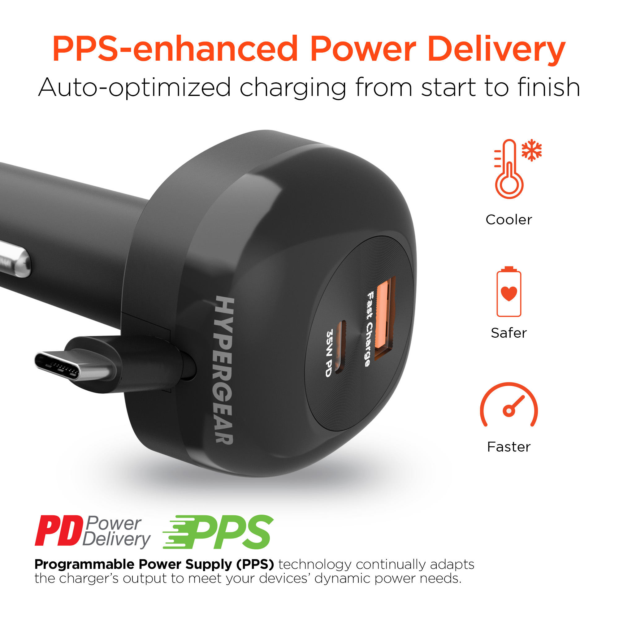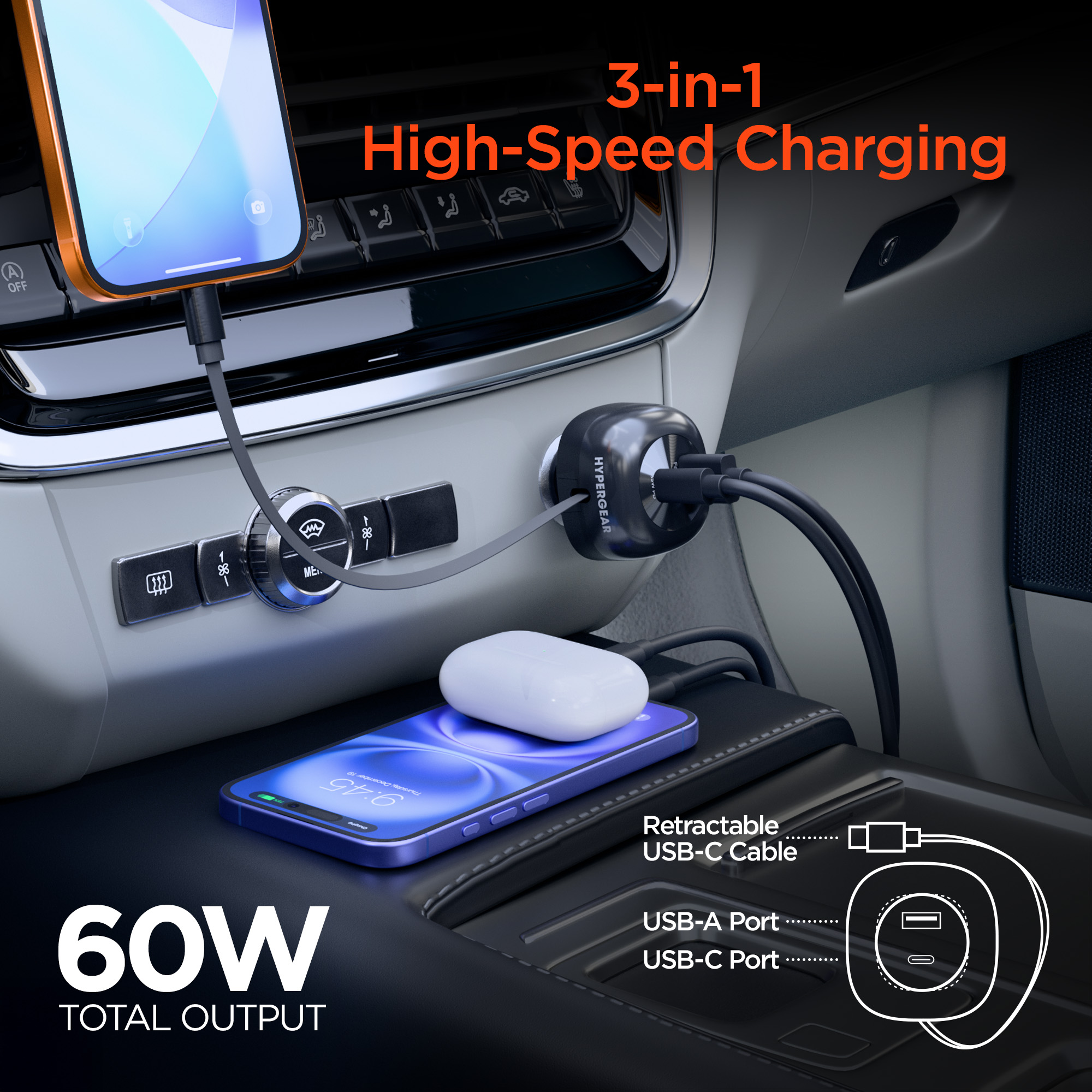 Fast power. Zero clutter. With the SpeedBoost 3-in-1 Fast Car Charger, you get a built-in 31.5-inch retractable USB-C cable equipped with 30W Power Delivery thats enough super-fast power to provide a max-speed charge to your phone, your tablet, or even your MacBook Air or Chromebook laptop. Just pull the cable out and plug it into your device, then let the cable automatically retract when youre done keeping your center console free and clear of any messy, tangled-up cables. With a second 30W USB-C PD port, you can super-fast charge two devices side-by-side and with an additional 18W USB port, you can turn your dashboard into a multi-device charging hub for 3 devices at the same time with up to 60W total output.