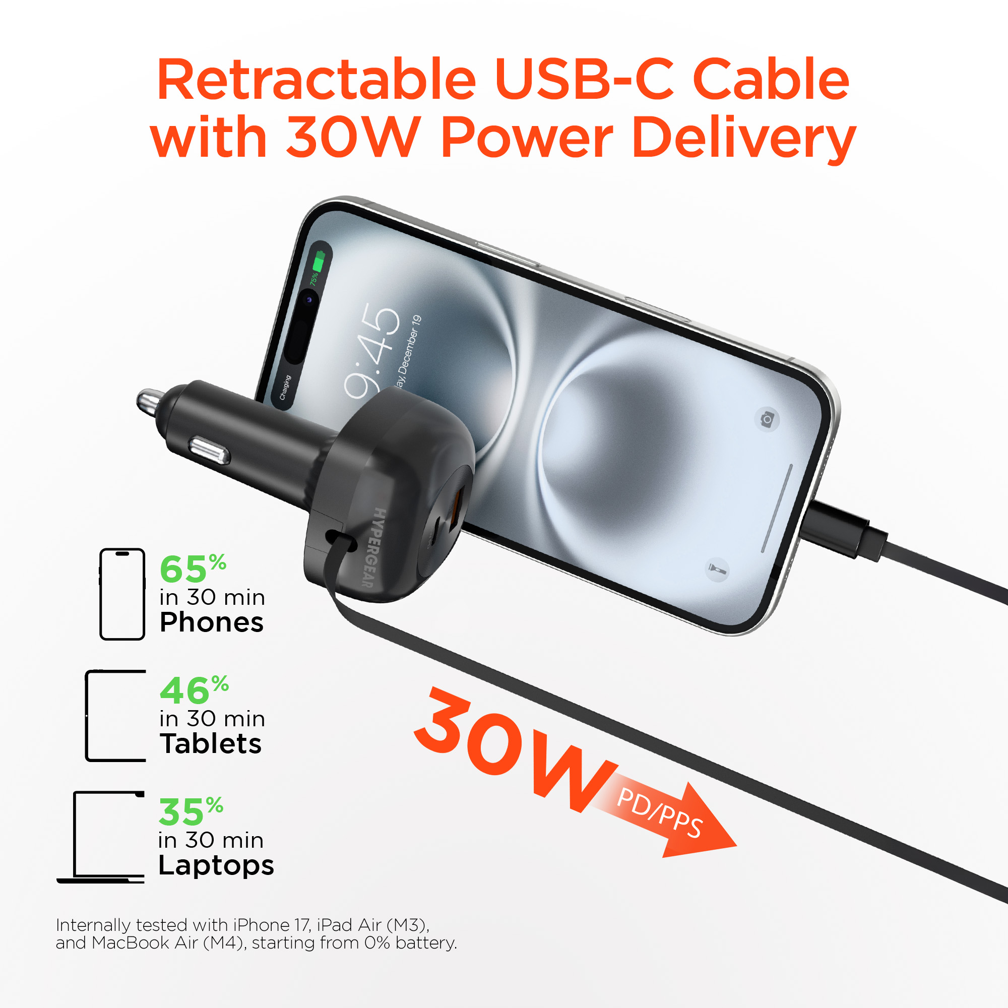 SpeedBoost 3-in-1 Fast Car Charger with Retractable 30W USB-C PD Cable | Black2 ports + built-in retractable cable | Super-fast charging for phones and tablets | Full-speed charging for 30W laptops |
