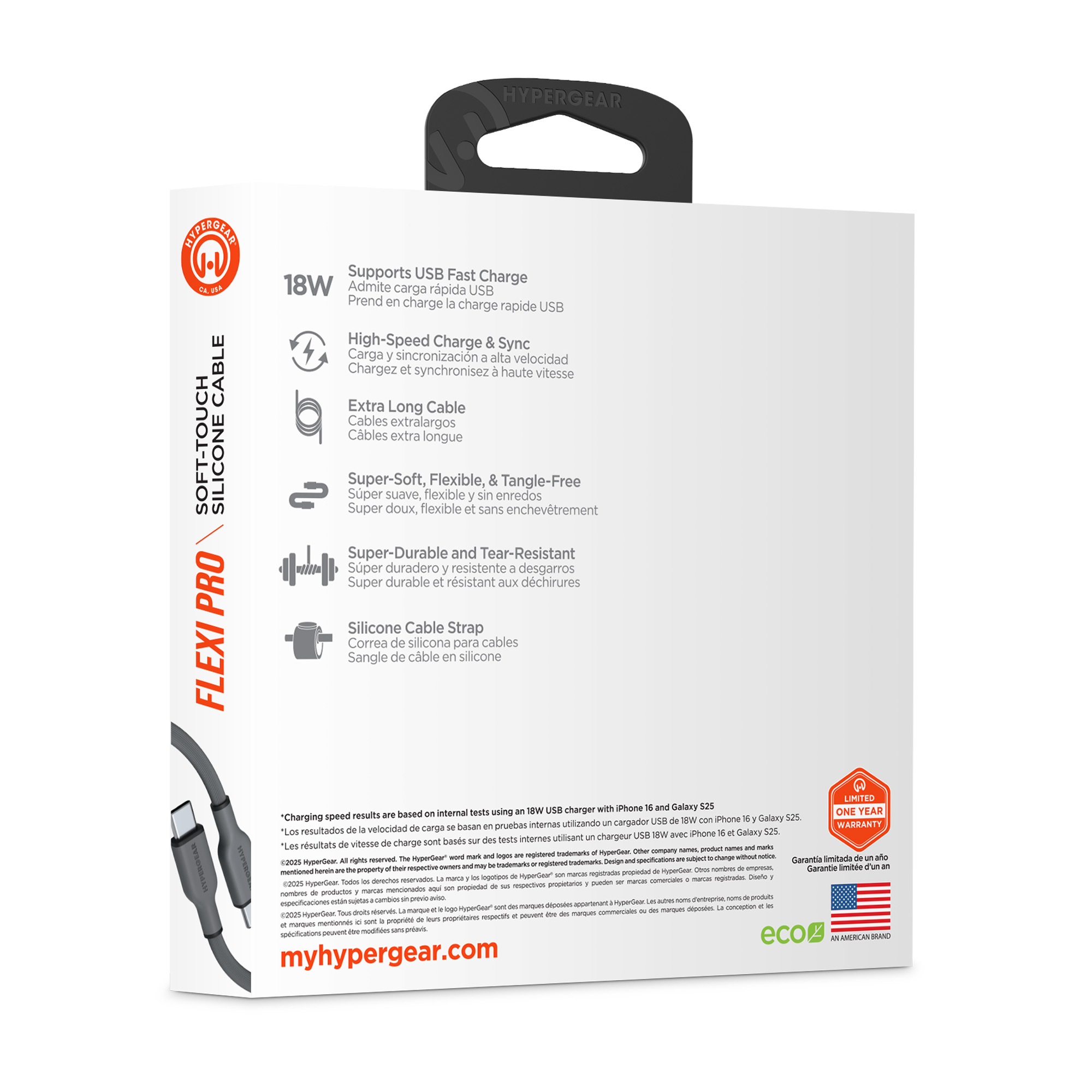 Its time for a charging upgrade. Super-soft and super-bendy, our Flexi Pro cables flow where you take them and stay where you want them no more twists, kinks, and tangles. The super-durable and tear-resistant exterior is 10X stronger than standard cables while being oh-so-soft to the touch, and it comes with a silicone cable strap for on-the-go convenience. Universally compatible with all USB-C devices from phones and tablets to headphones and video game controllers.