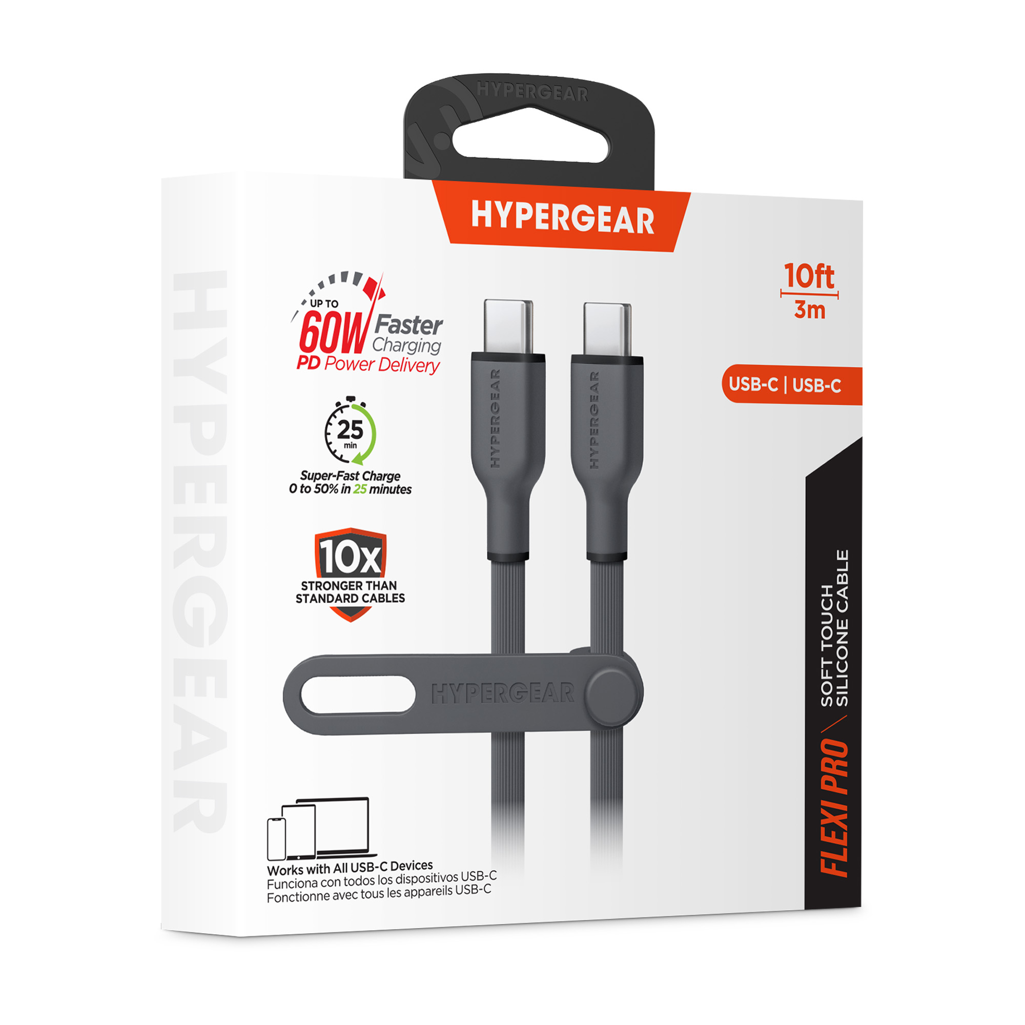 Flexi Pro USB-C to USB-C Soft-Touch Fast Charge Cable | 10ft | GrayPD fast charge and sync for USB-C devices | XL extended length | Super-soft, super-bendy, and super-durable |
