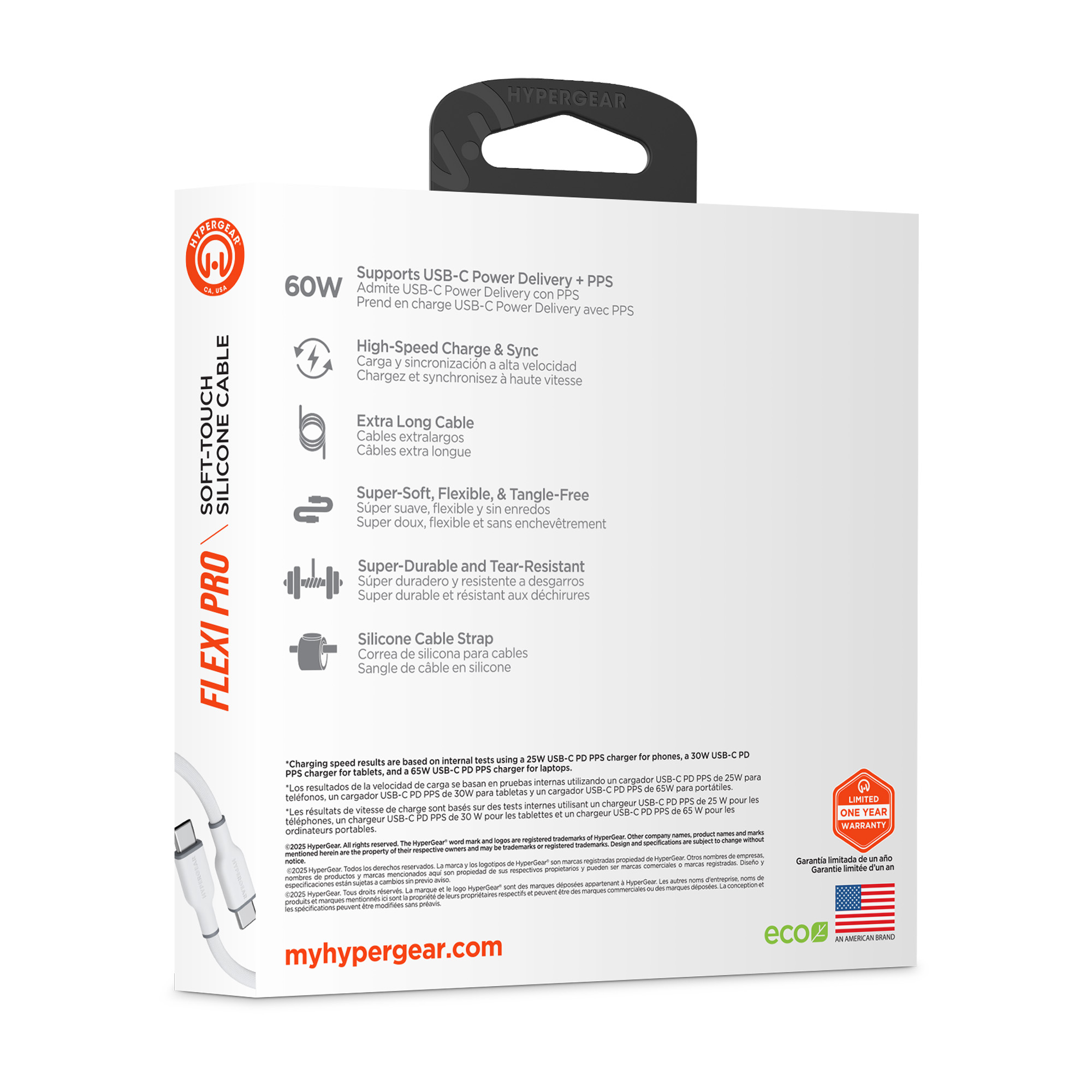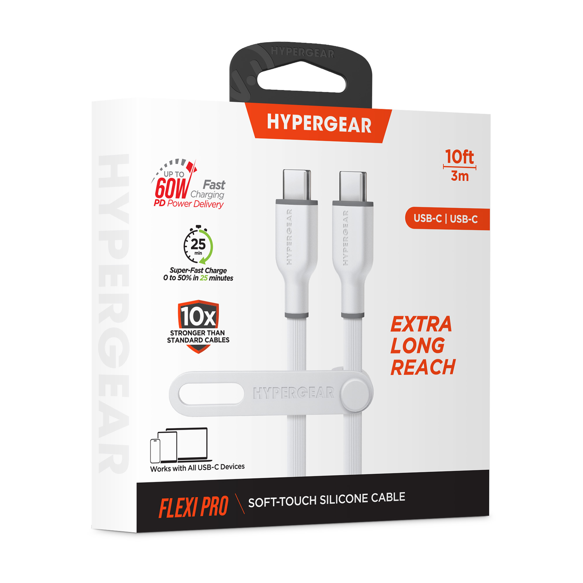 Its time for a charging upgrade. Super-soft and super-bendy, our Flexi Pro cables flow where you take them and stay where you want them no more twists, kinks, and tangles. The super-durable and tear-resistant exterior is 10X stronger than standard cables while being oh-so-soft to the touch, and it comes with a silicone cable strap for on-the-go convenience. Universally compatible with all USB-C devices from phones to laptops, and Power Delivery-enabled so you can super-fast charge your iPhone 15 or Android phone from 0 to 50% in just 25 minutes.