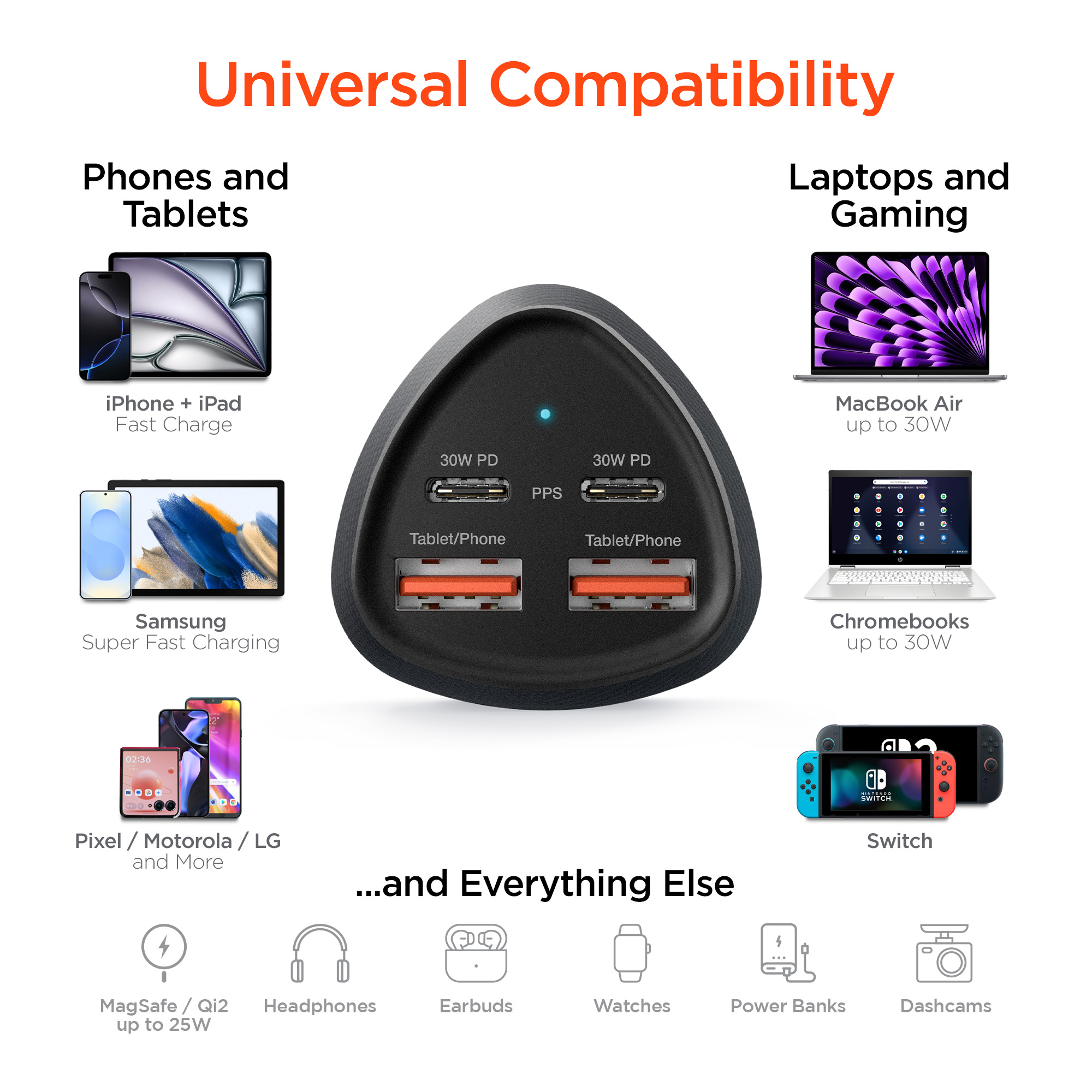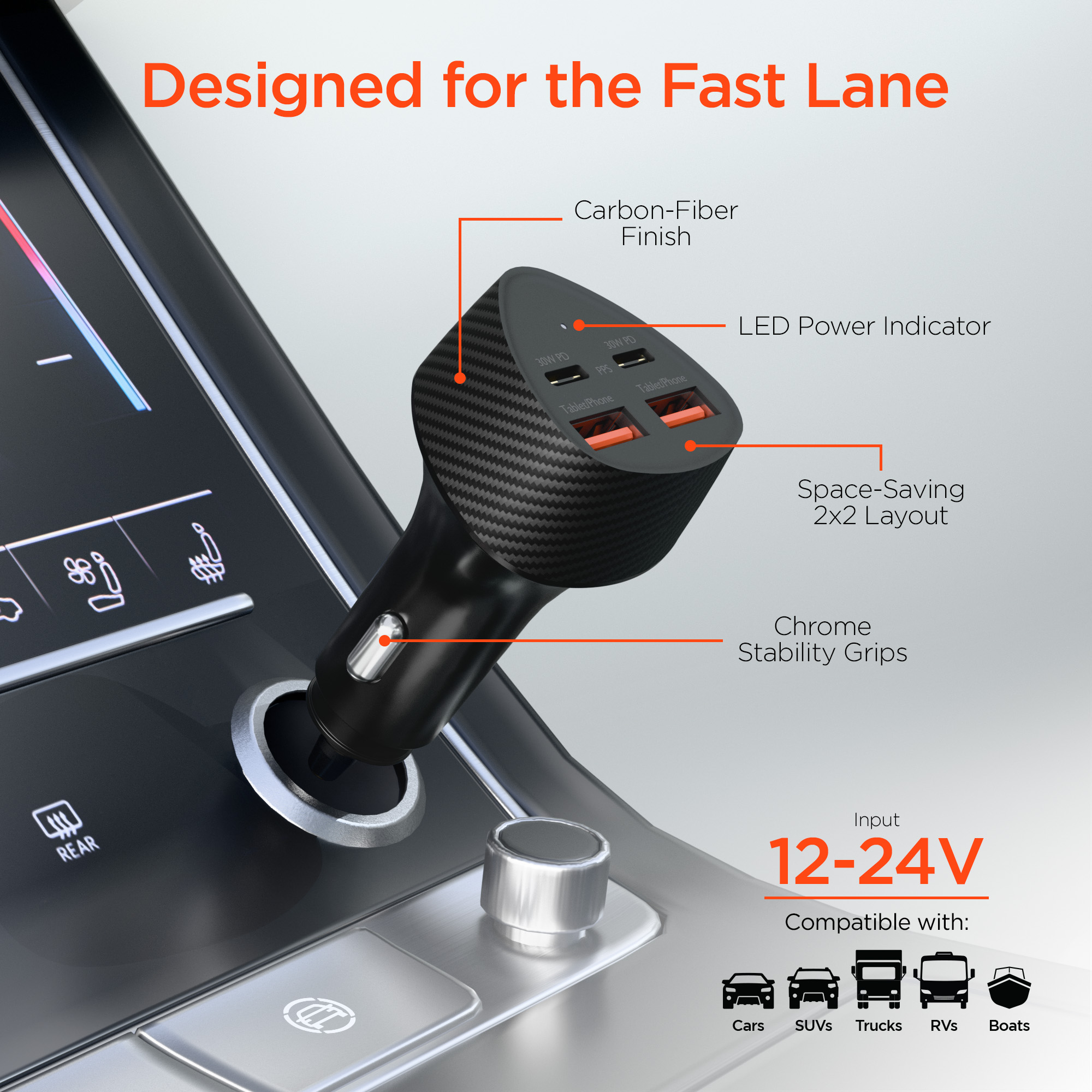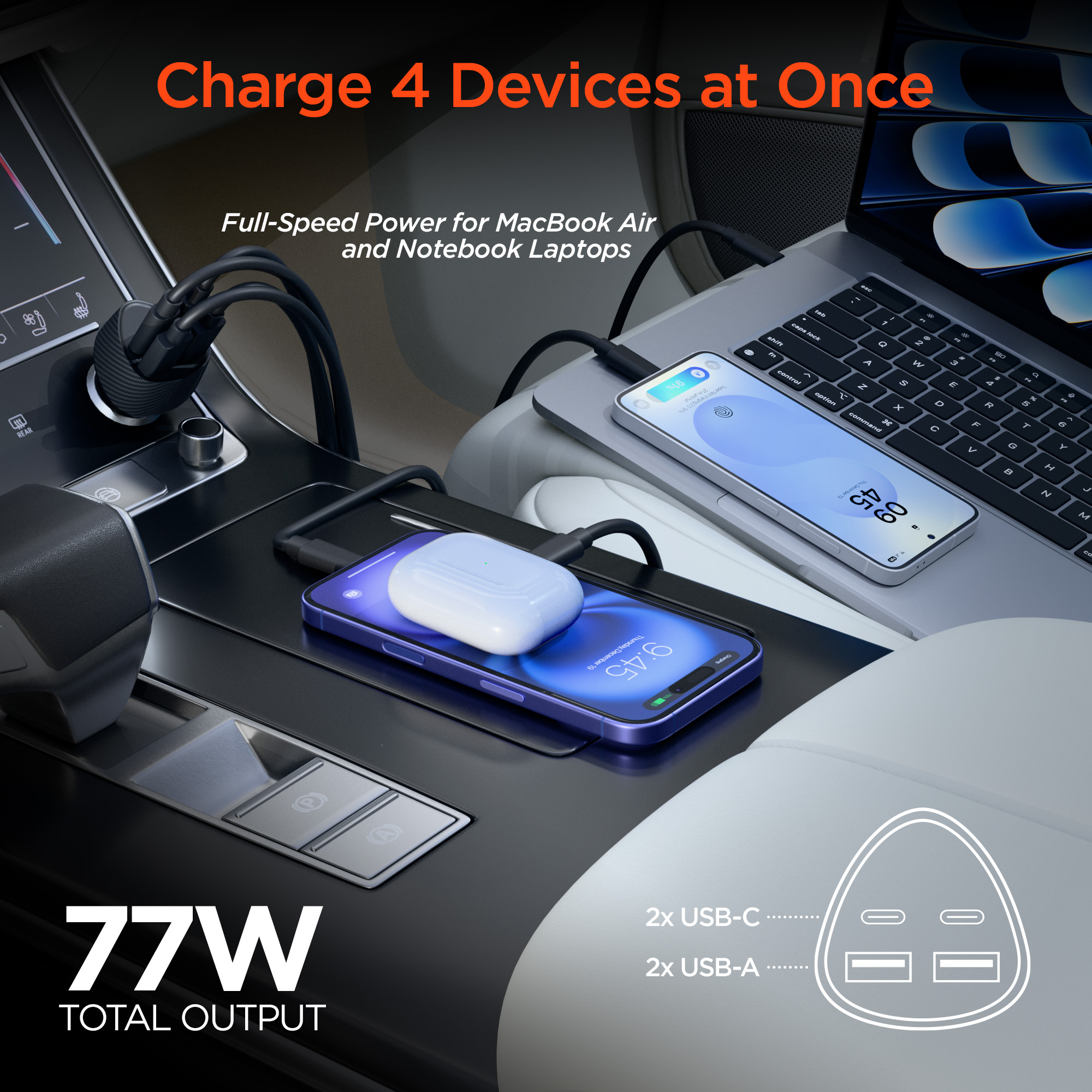 SpeedBoost 77W Quad-Port Fast Car Charger with Dual 30W USB-C PD PPS | 4ft USB-C Cable | Black4-port design | Dual super-fast charging for phones and tablets | Full-speed charging for MacBook Air and Chromebooks |