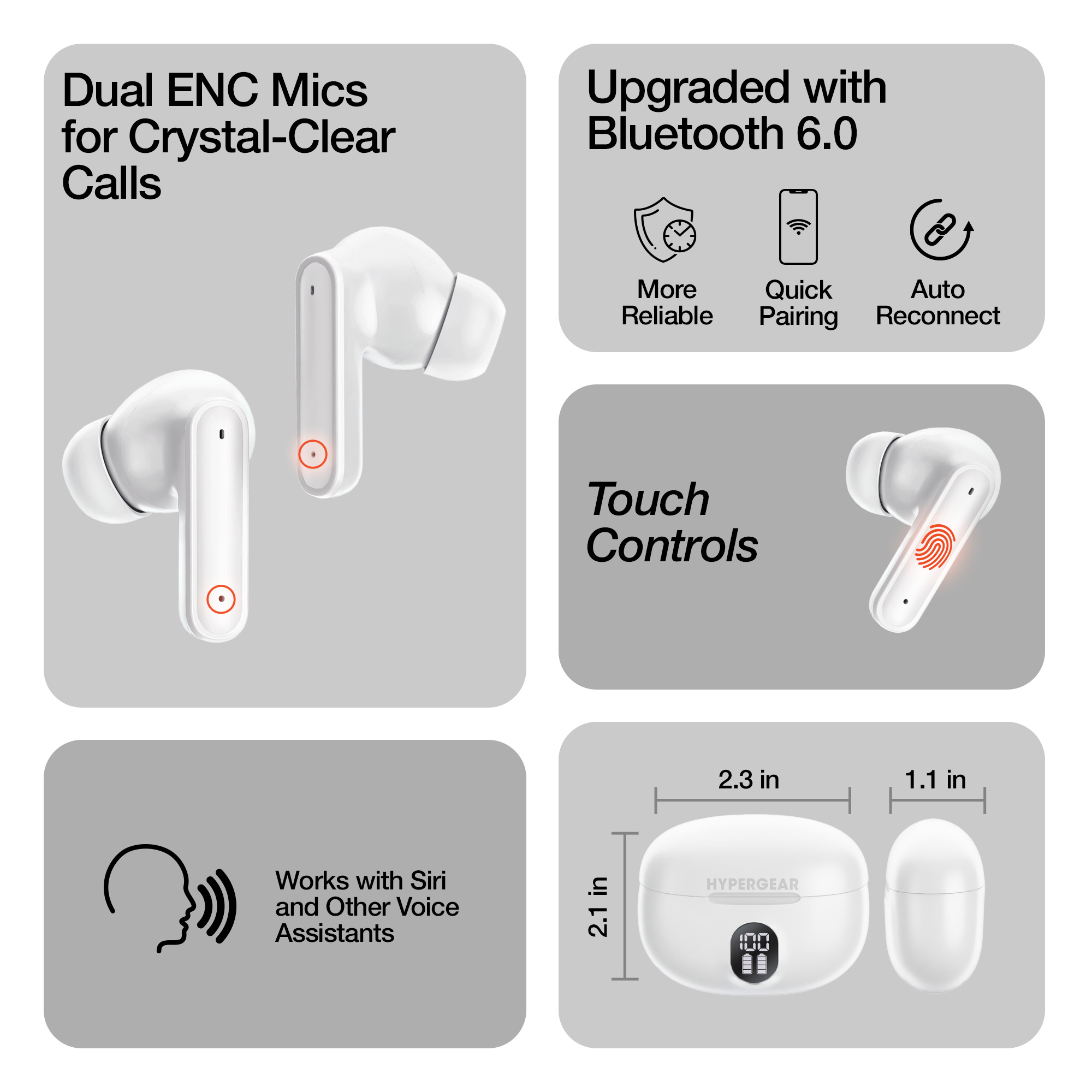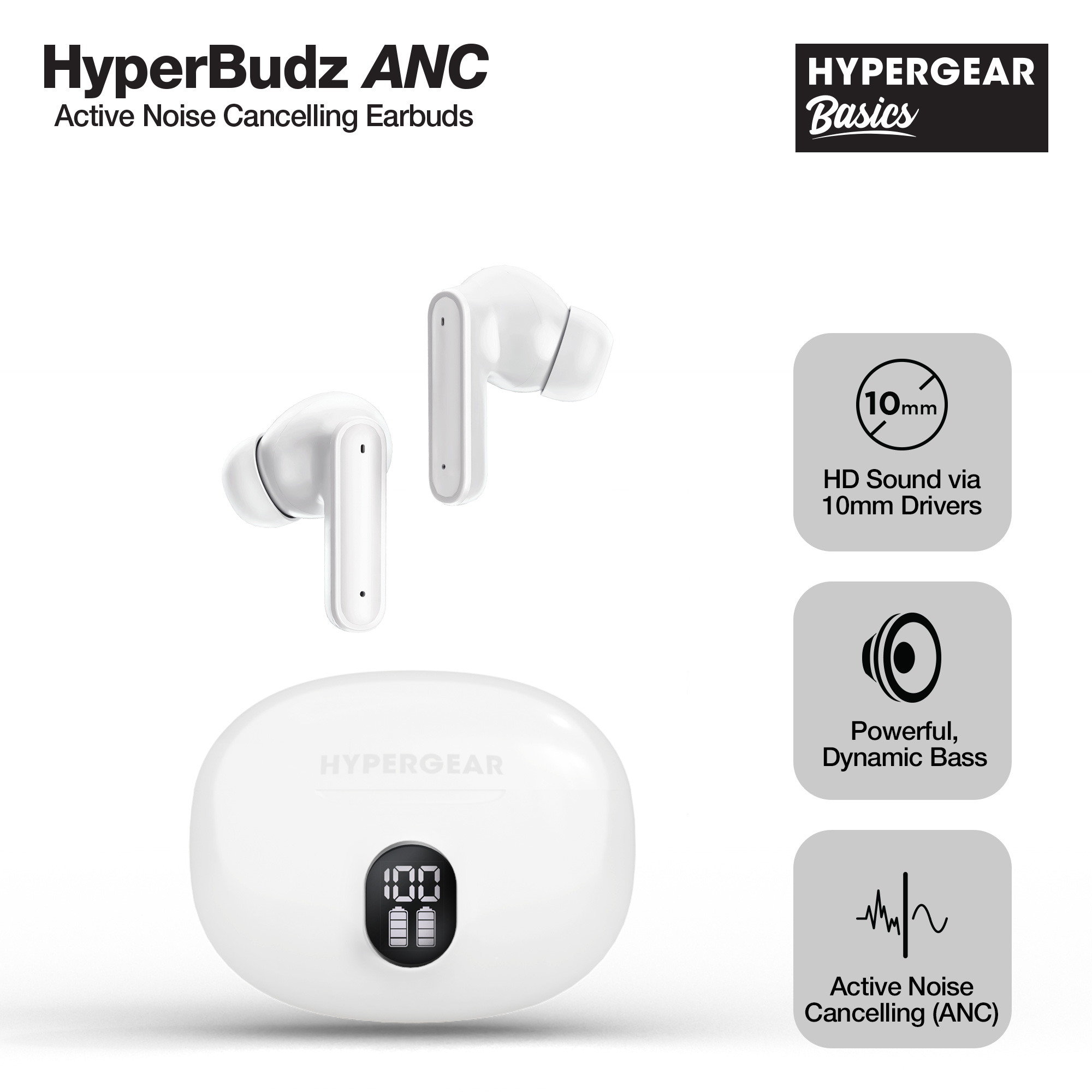 HyperGear Basics | HyperBudz ANC Active Noise Cancelling True Wireless Earbuds | WhiteStunning HD sound ANC + Transparency modes and a secure in-ear fit. Up to 24HRS of music and crystal-clear ENC calls. |