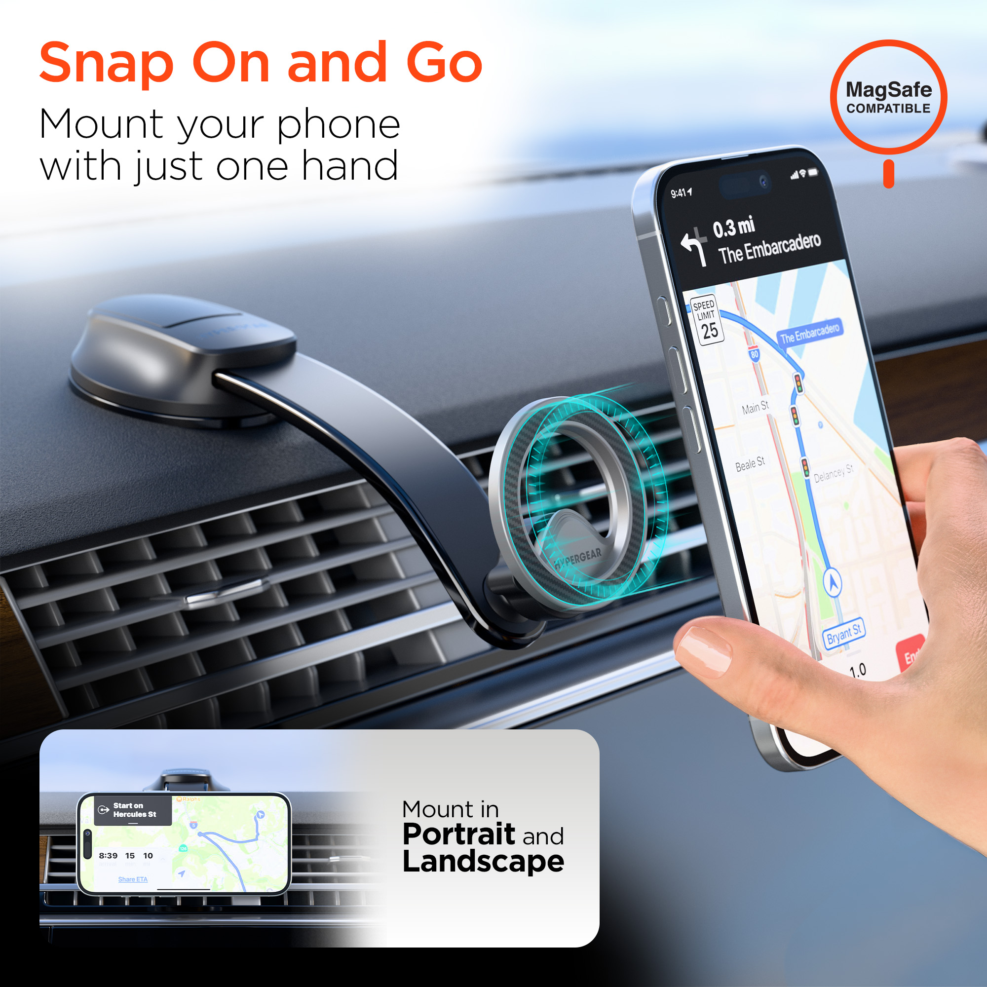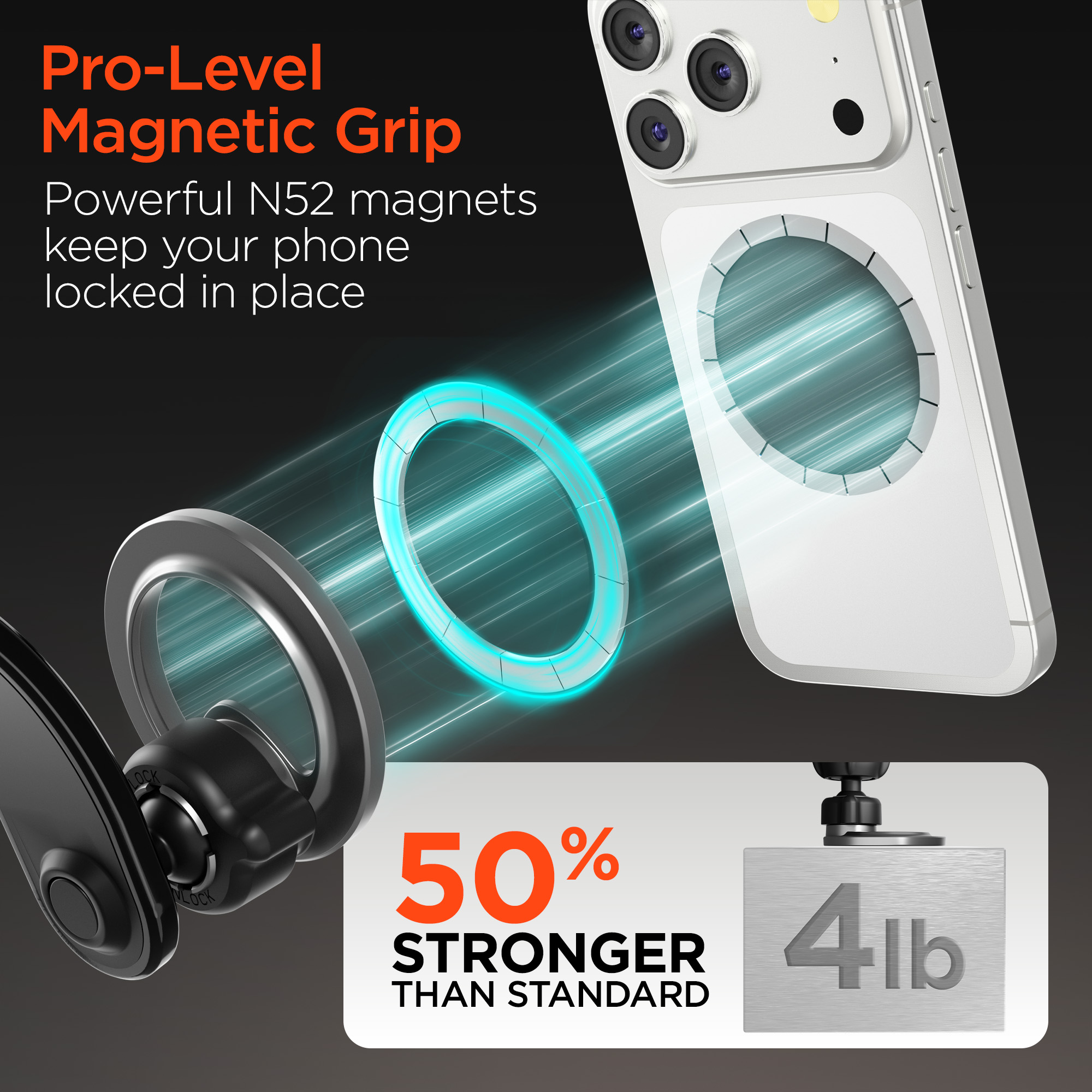 Snap On Drive Snap Off Its that easy. Designed with an ultra-slim profile and a sleek carbon-fiber surface, the Mag Grip Pro Magnetic Phone Mount from HyperGear levels up your daily drive with MagSafe convenience and minimalist style. Its built with twelve N52-grade magnets for a more powerful magnetic grip, making it 50% stronger than standard and rated to hold up to 4 pounds of weight so your phone stays locked in place no matter how rough the road gets. Compatible with MagSafe iPhone models and cases, and includes an adhesive adapter ring for non-MagSafe cases and Android devices.