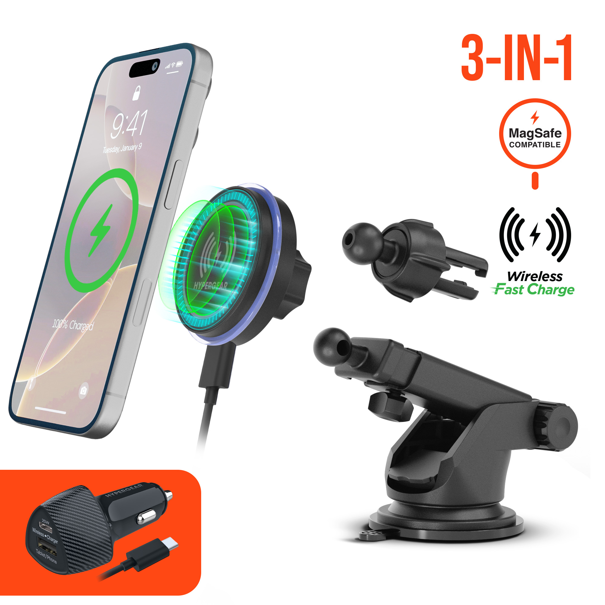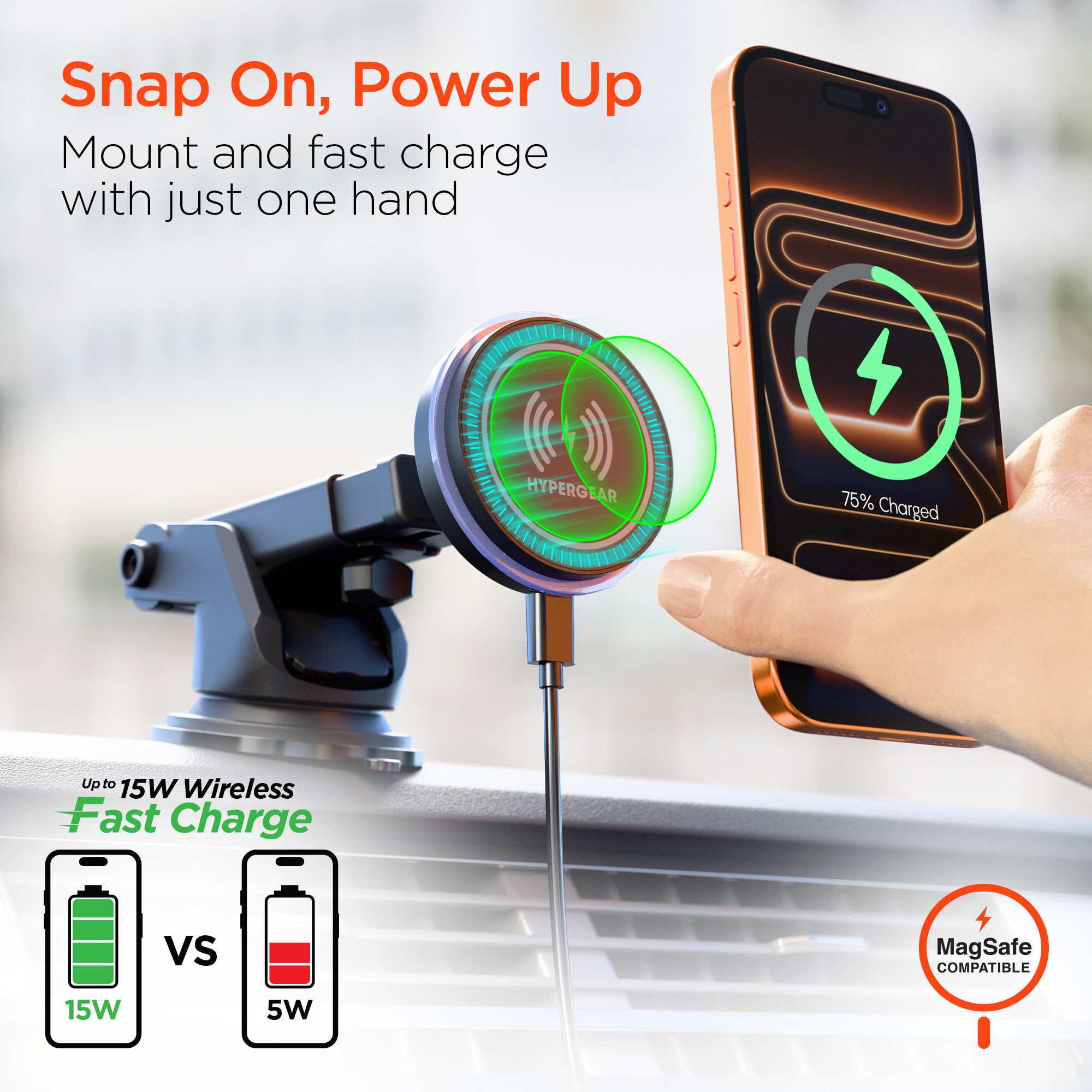 Charge at max speed with the MaxCharge Magnetic Wireless Fast Charging Mount from HyperGear. Featuring MagSafe compatibility for iPhone and MagSafe cases, a ring of built-in magnets automatically aligns your phone with the sweet spot for optimal wireless charging just hold your phone up to the mount and feel the powerful magnetic force lock it into place with a satisfying snap! Get up to 15W of fast wireless power while securing your phone at eye level and within easy reach in portrait or landscape mode.