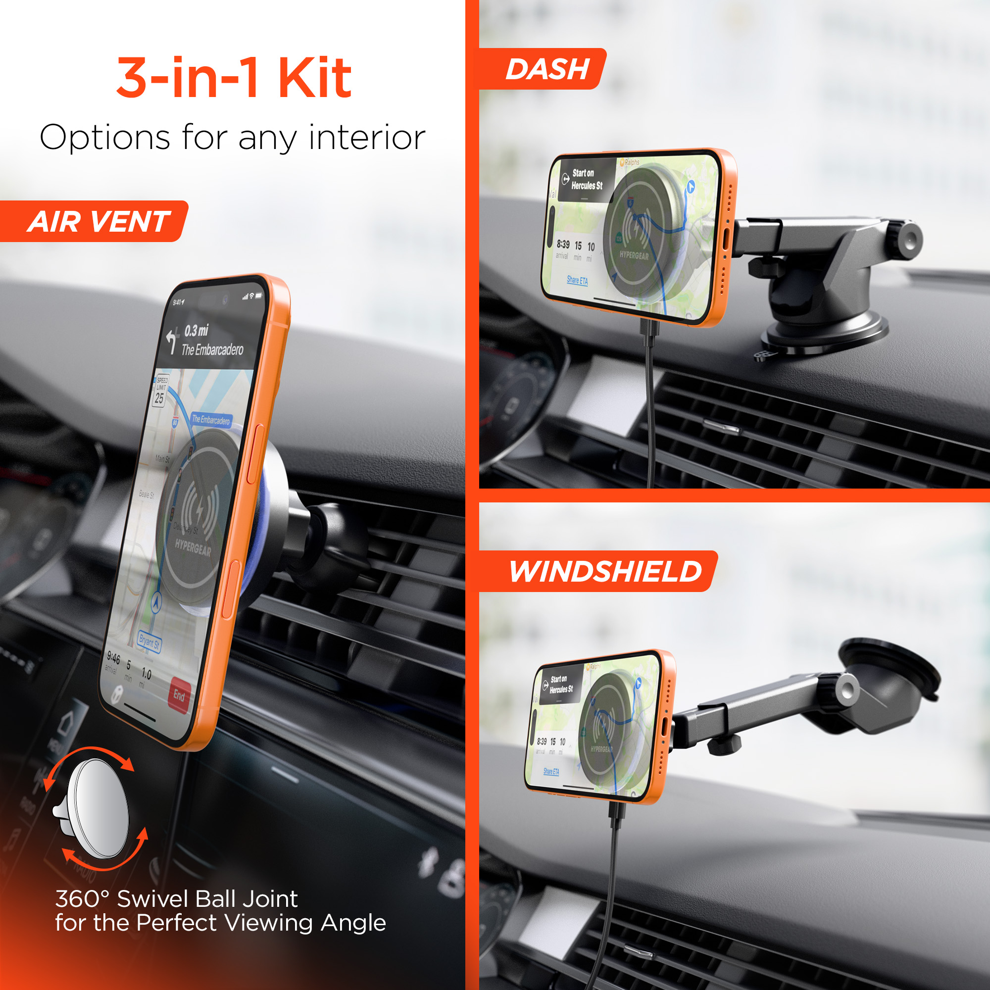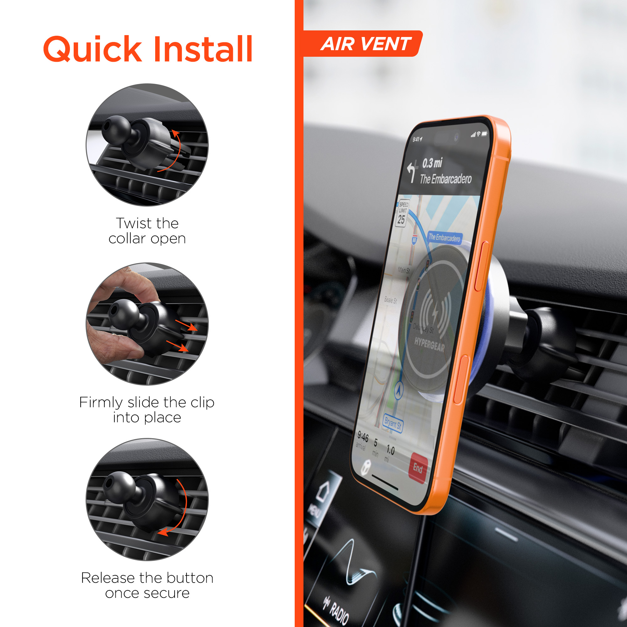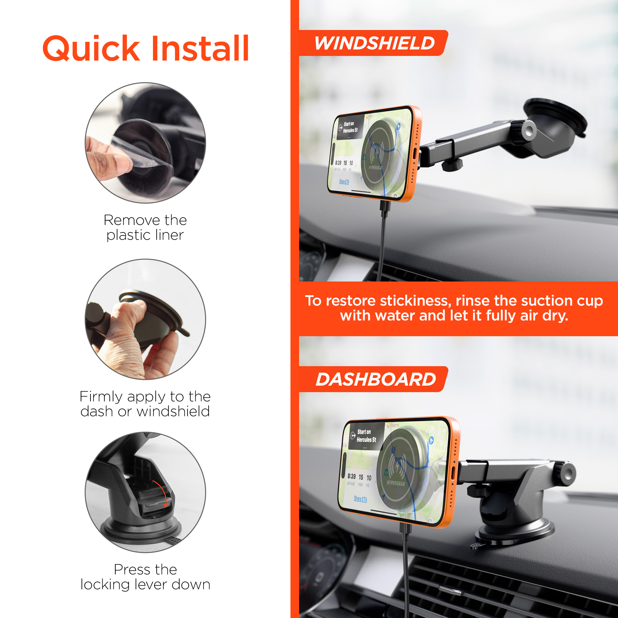 MaxCharge 15W Magnetic Wireless Fast Charging Phone Mount | Vent + Dashboard + Windshield | Black MagSafe-compatible with an ultra-compact, low-profile design. Includes air vent clip and telescopic arm mount bases. |
