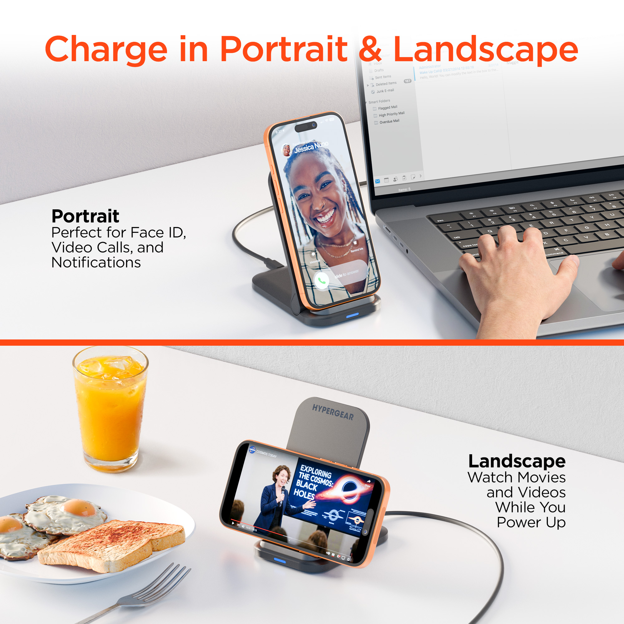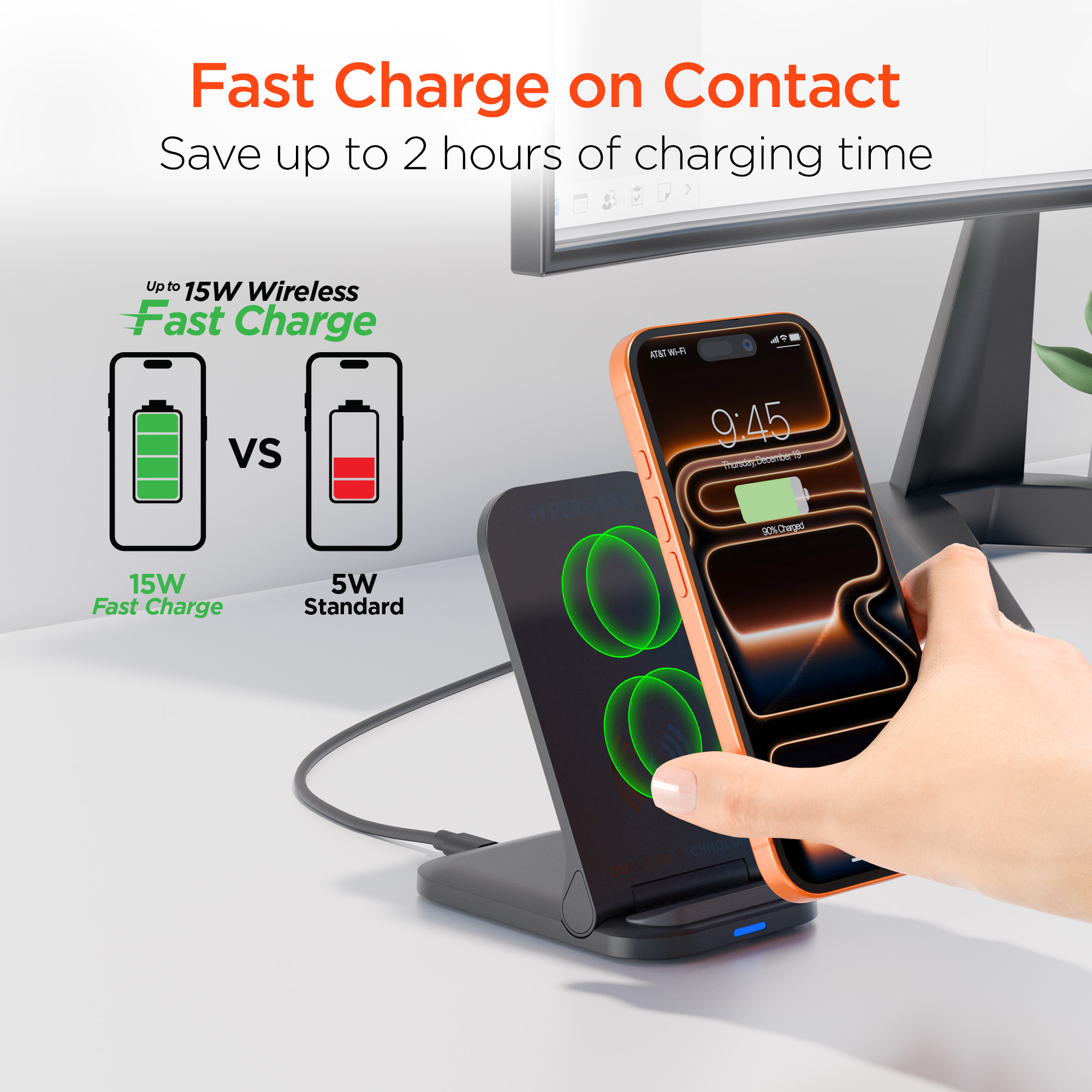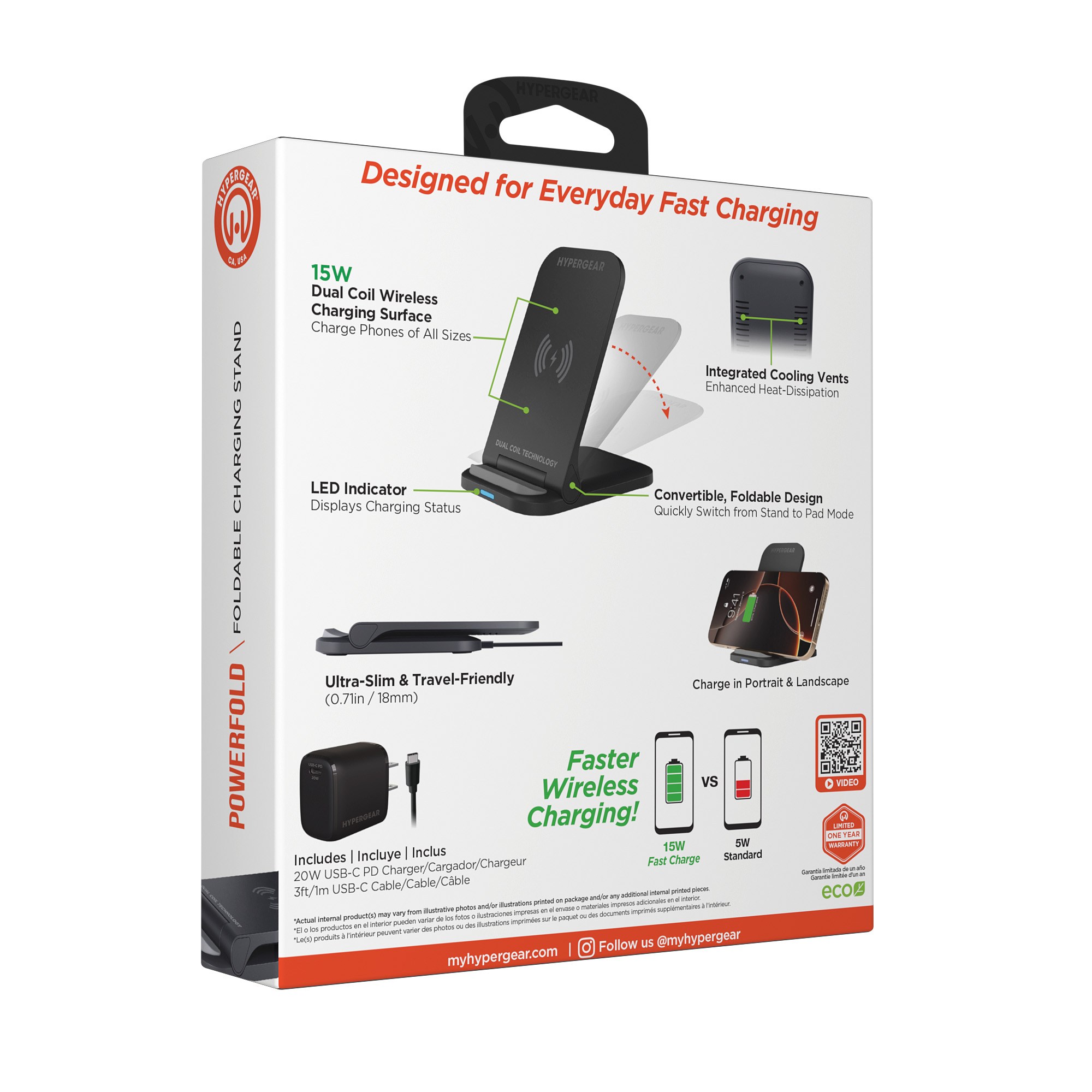 Fast charge on contact with the PowerFold Wireless Charging Stand from HyperGear. Designed for everyday charging, just place your Qi-enabled phone on the stand to power up with your screen in view so you can watch videos, play games, or keep an eye on your notifications while you work. The dual coil charging surface delivers up to 15W and makes wireless charging effortlessly easy no more worrying about finding the sweet spot, and you can even charge in both portrait and landscape! Need to charge your earbuds instead? Fold the stand down to convert it into a charging pad and with its ultra-slim profile, its perfectly portable and great for wireless charging on the go.
