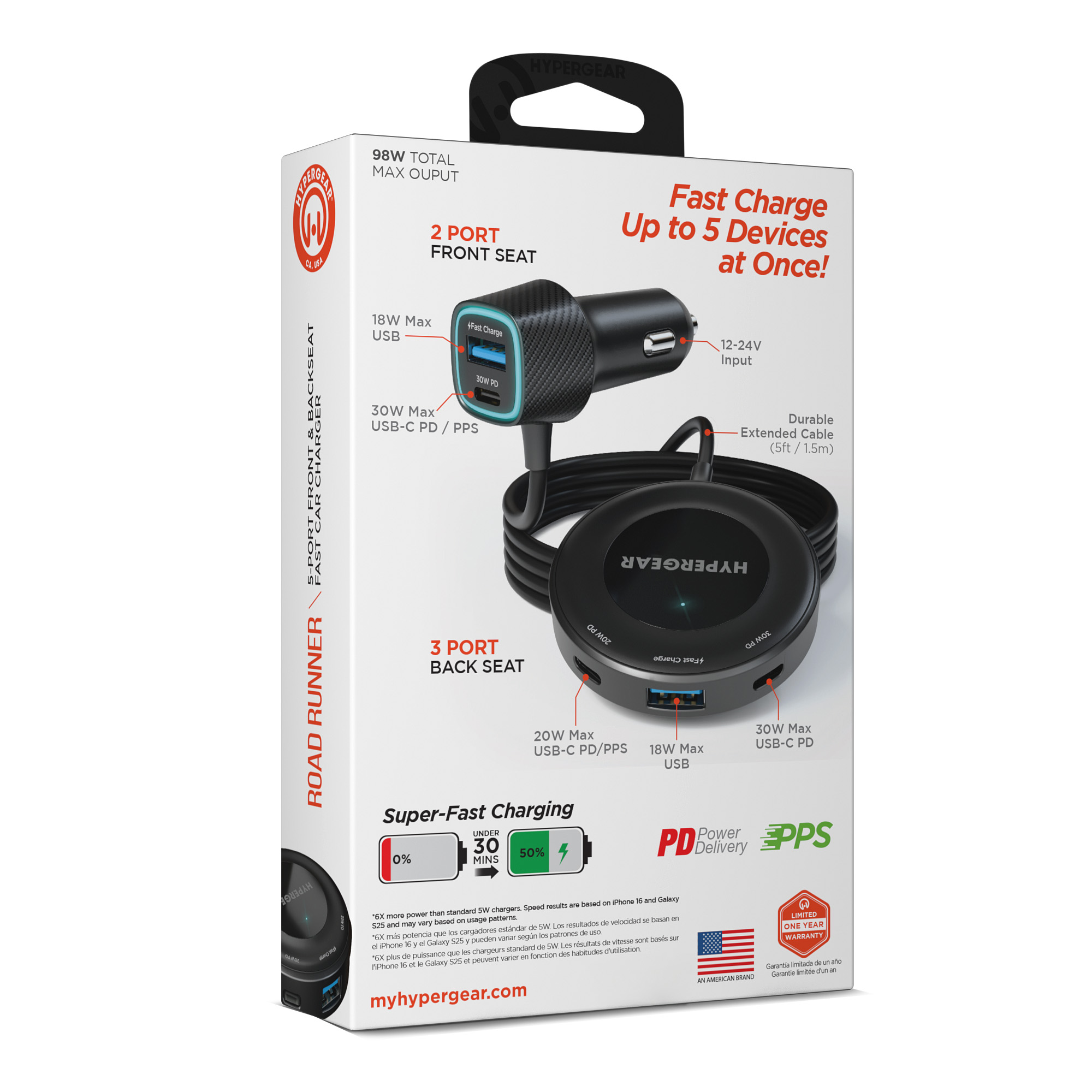 Road Runner 98W 5-Port Front & Backseat Fast Car Charger with Dual 30W USB-C PD PPS | Black5-port design | Dual super-fast charging for phones and tablets | Full-speed charging for MacBook Air and Chromebooks |