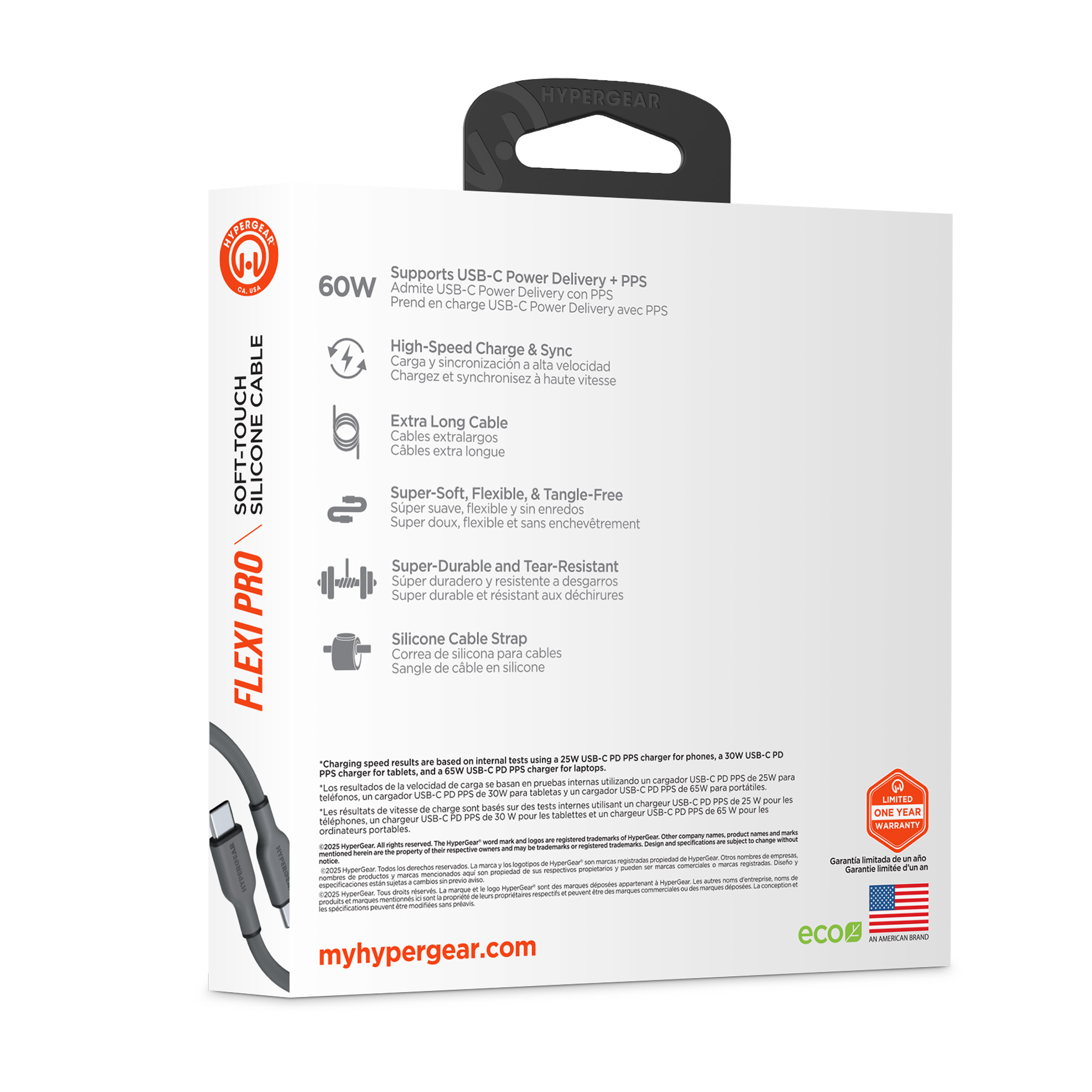 Its time for a charging upgrade. Super-soft and super-bendy, our Flexi Pro cables flow where you take them and stay where you want them no more twists, kinks, and tangles. The super-durable and tear-resistant exterior is 10X stronger than standard cables while being oh-so-soft to the touch, and it comes with a silicone cable strap for on-the-go convenience. Universally compatible with all USB-C devices from phones to laptops, and Power Delivery-enabled so you can super-fast charge your iPhone 15 or Android phone from 0 to 50% in just 25 minutes.