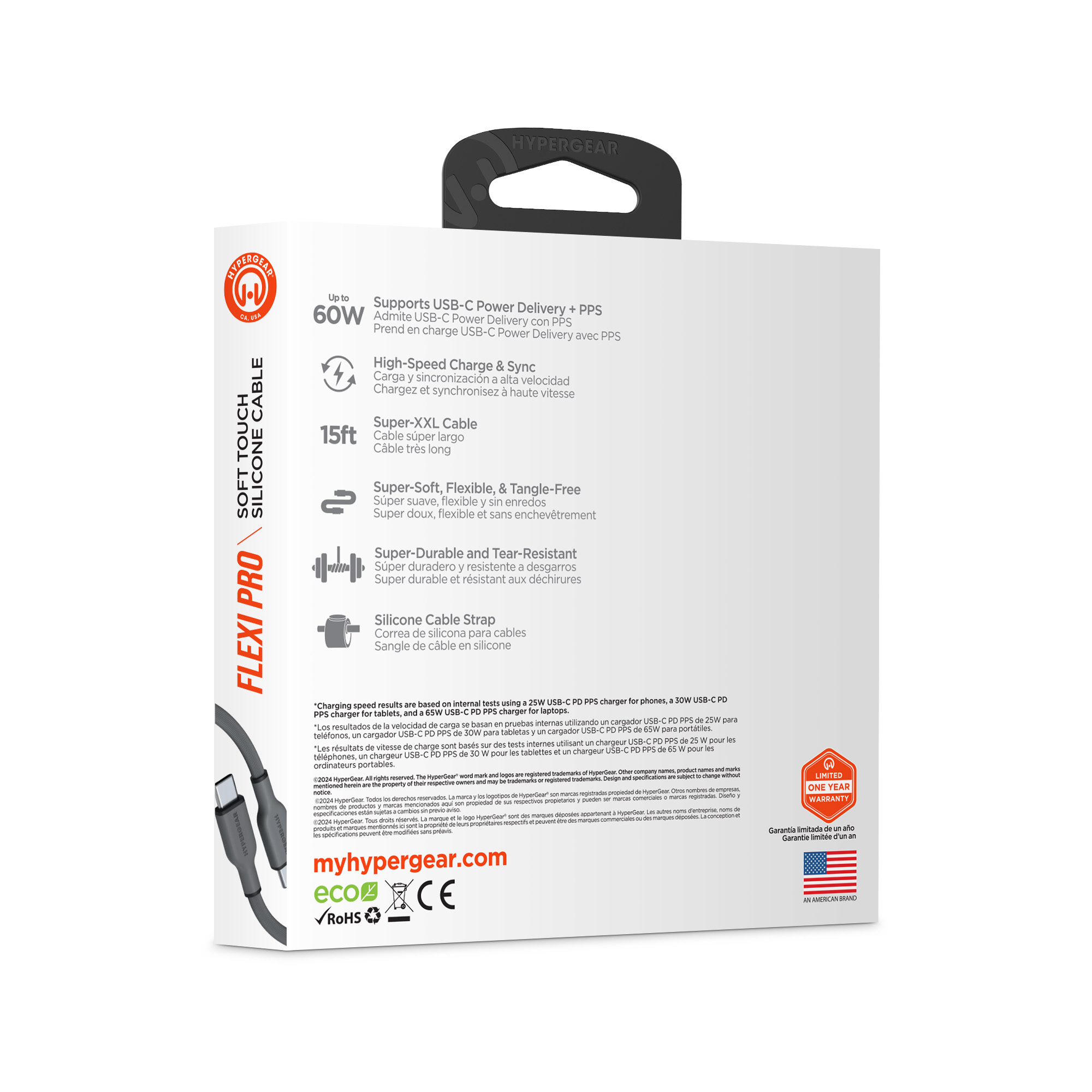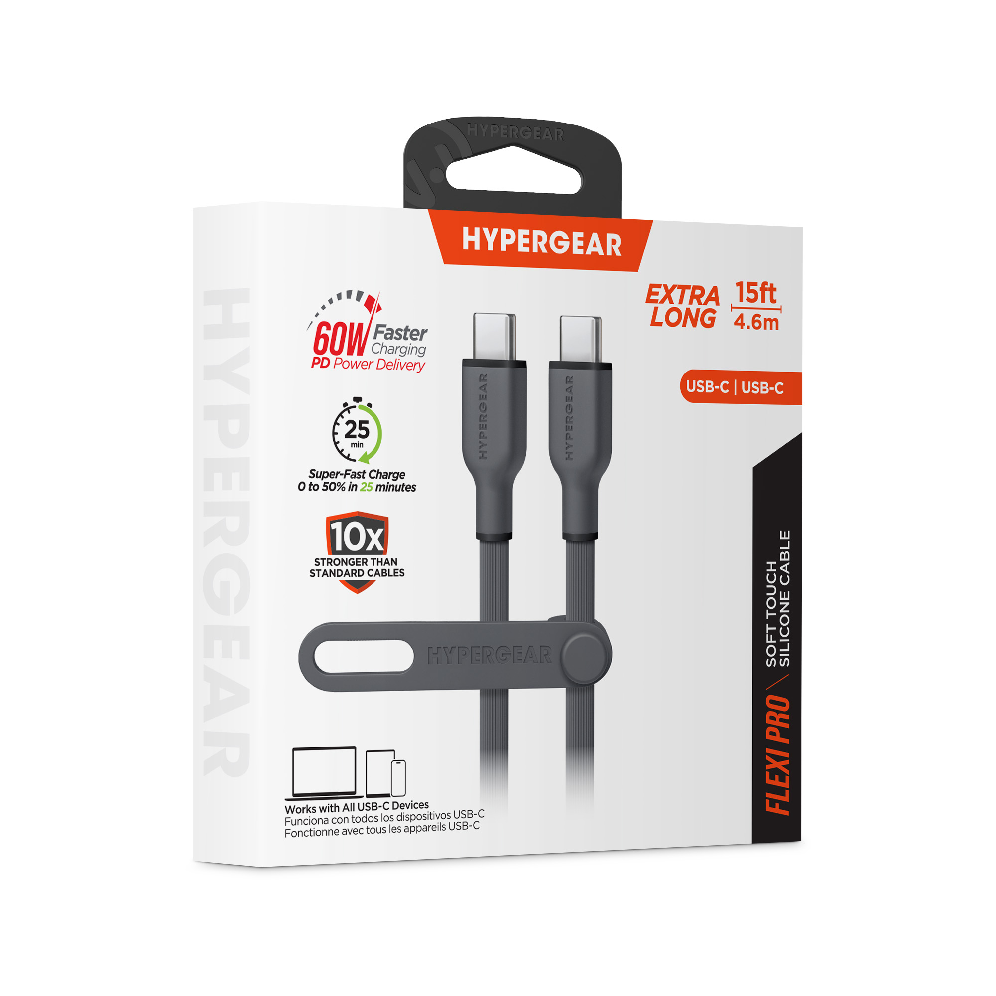 Its time for a charging upgrade. Super-soft and super-bendy, our Flexi Pro cables flow where you take them and stay where you want them no more twists, kinks, and tangles. The super-durable and tear-resistant exterior is 10x stronger than standard cables while being oh-so-soft to the touch, and it comes with a silicone cable strap for on-the-go convenience. Universally compatible with all USB-C devices from phones to laptops, and Power Delivery-enabled so you can super-fast charge your iPhone 15 or Android phone from 0 to 50% in just 25 minutes.
