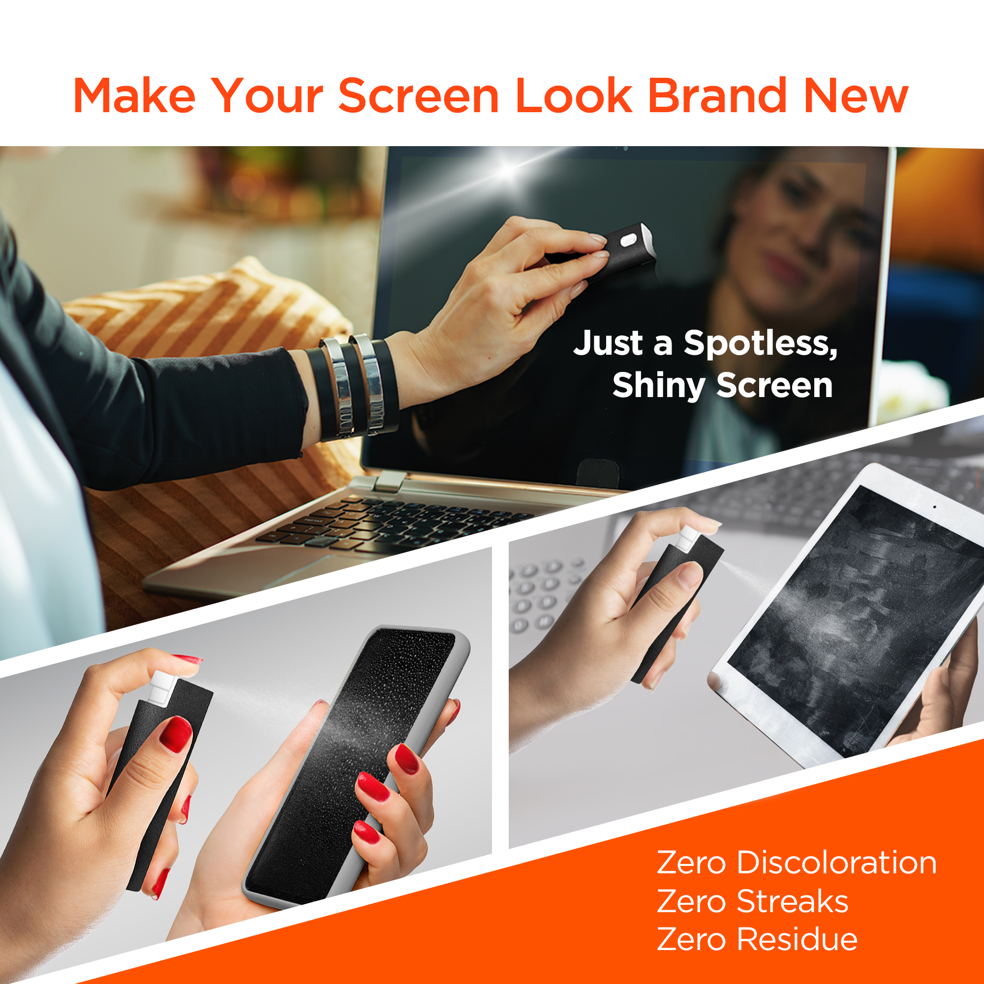Make your screen look brand new. The convenient all-in-one design provides every essential for your screen cleaning needs anywhere you go with a 0.3 fl oz travel-sized bottle of our proprietary cleaning solution and a built-in microfiber polishing cloth. Spray and wipe to leave any device spotless and say goodbye to the streaks, smudges, and fingerprints littering your screens. Our cleaning solution is derived from natural ingredients and features an odorless, eco-friendly, non-toxic, alcohol and ammonia-free formula that contains no dyes or harsh chemicals! Proper tech hygiene can extend your devices lifetime by preserving the integrity of your screen, so we tested across every type of screen to ensure that all your devices will be left 99.99% clean and protected from dust, dirt, oil, and gunk. Use ScreenWhiz for an unbeatable, streak-free shine!